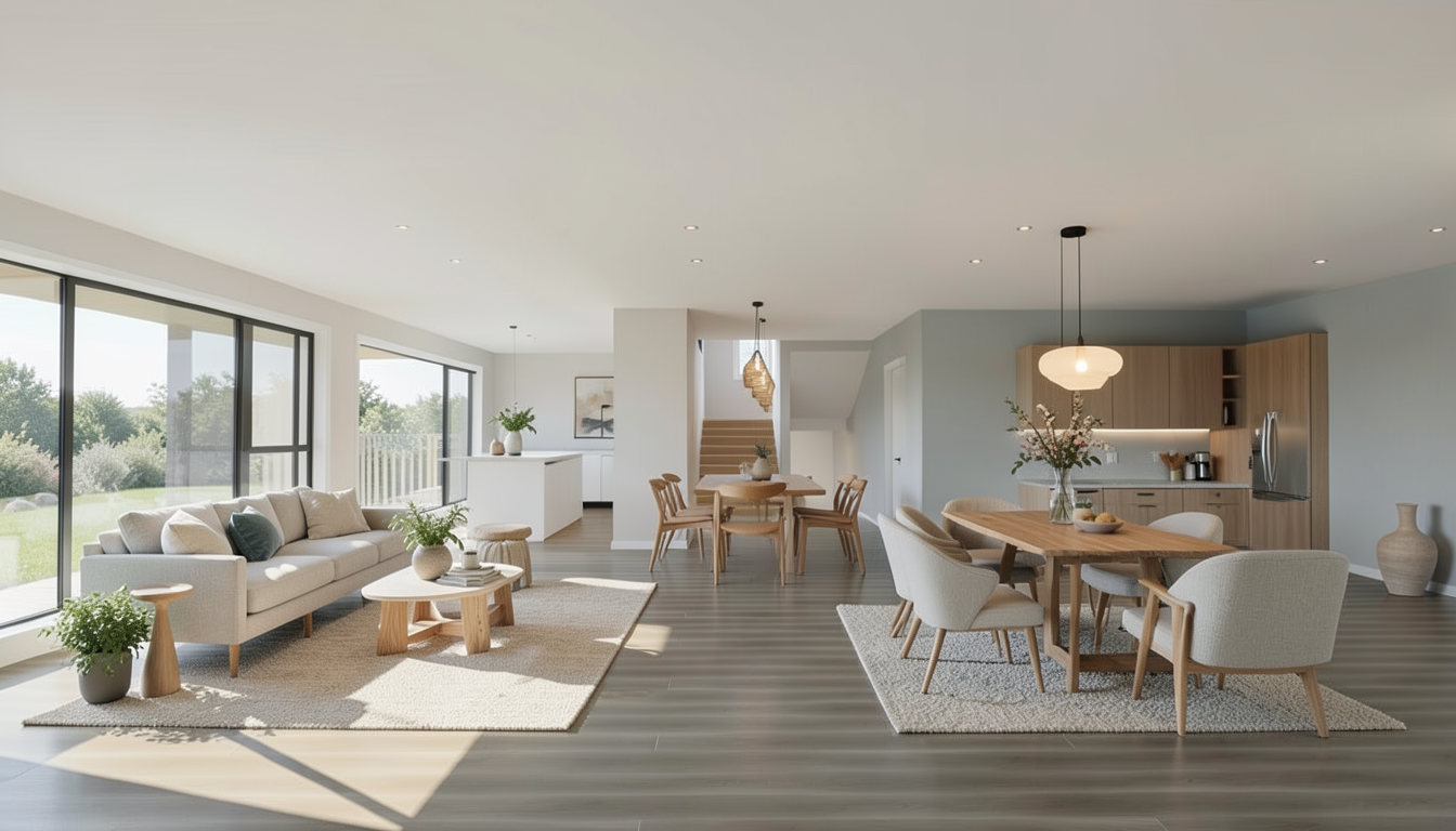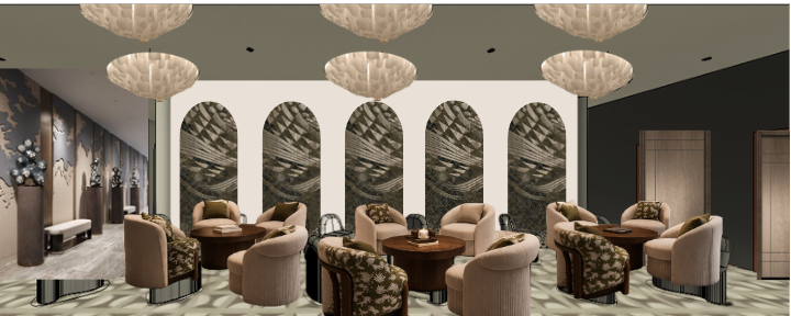 create a luxurious and elegant lounge interior with a warm inviting atmosphere use soft beige and taupe tones for the plush curved seating arrangements complemented by dark rich wood for the tables the walls should have a combination of dark textured patterns and soft off white shades to add depth and sophistication incorporate large flowing arch designs filled with intricate wave like patterns in deep gray and black install warm ambient lighting fixtures with cream colored shades that cast a soft glow the flooring should feature a subtle geometric pattern in muted beige and cream for a seamless blend with the overall decor add an artistic wall mural with floral elements in muted tones harmonizing with the serene yet upscale environment