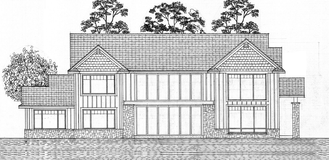 exterior shot a modern two story house with large windows and a gabled roof set amidst lush greenery use warm earthy colors sandy beige for walls charcoal gray for roof shingles and natural stone textures in soft gray tones for accents emphasize the large windows with clear reflective glass surround the house with lush greenery and tall trees in varying shades of vibrant greens the atmosphere is serene and inviting captured during a golden hour with soft sunlight filtering through the leaves creating a peaceful idyllic setting