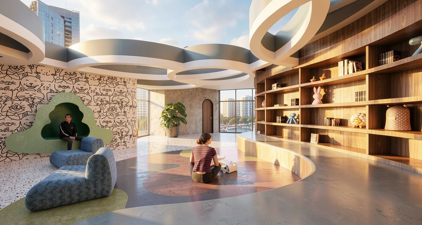 new modern housing in green area sport fields in gradd add greenery around like burle marx di not invent buildings keep the plan
