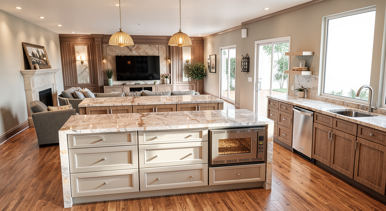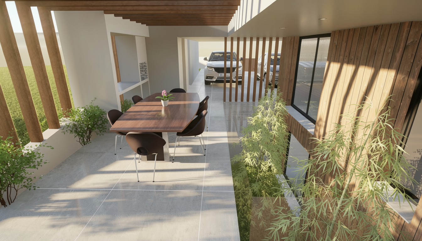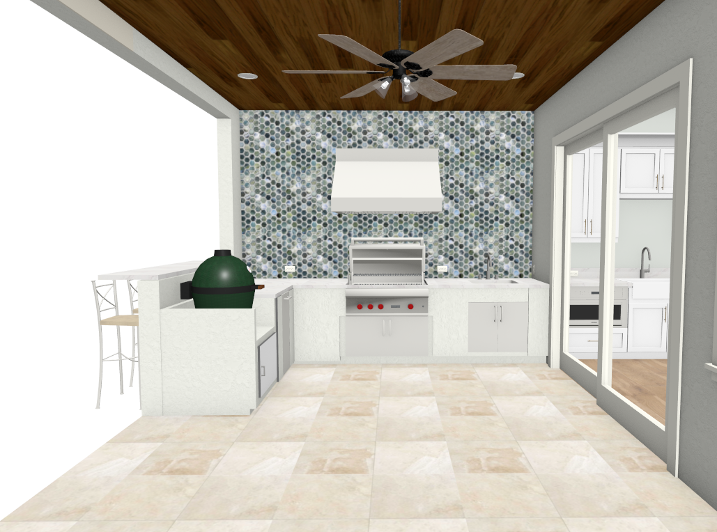 clean up add decor this is an open patio with no wall on the left just an opening to the pool the cabinets are actually stucco so remove the lines add patio furniture