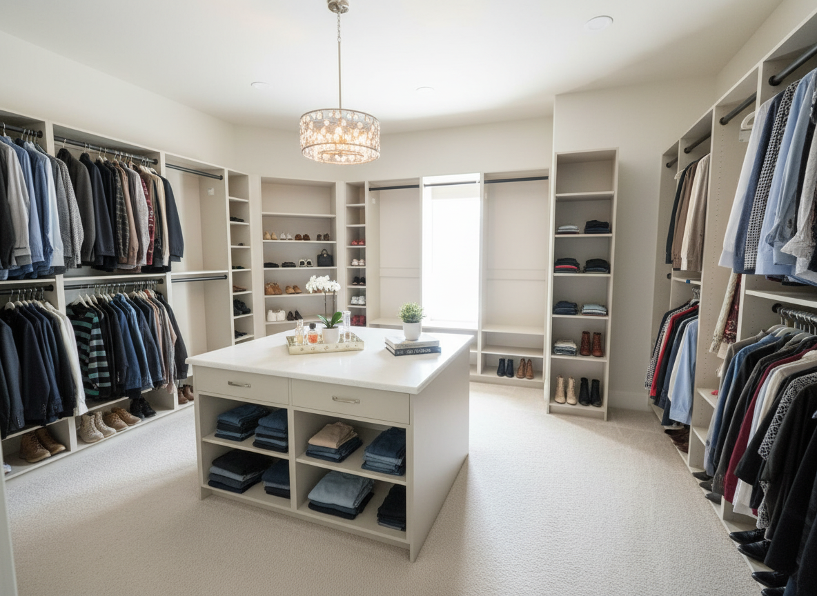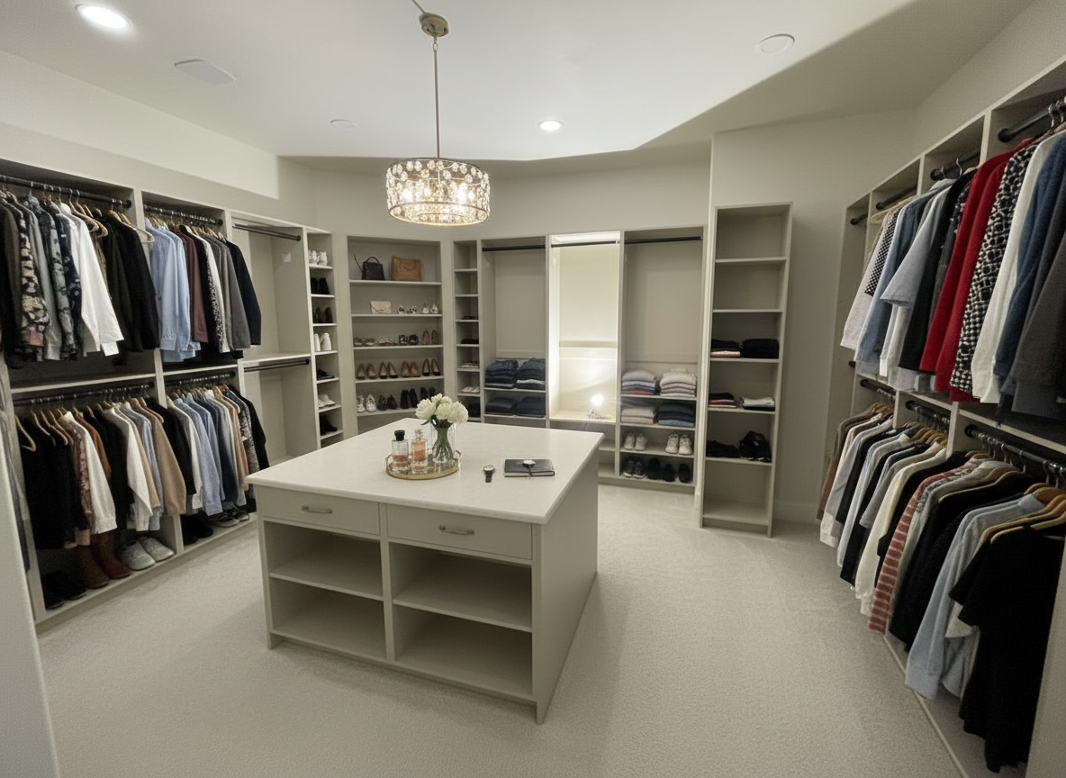 get rid of the cords boxes everything on the countertop replace with clean white carpet add clothes to all of the hanging rods include shoes purses and folded clothes onto the shelves make the chandelier lit and stage the countertop get rid of the flashlight in the cabinet on the back wall increase natural light