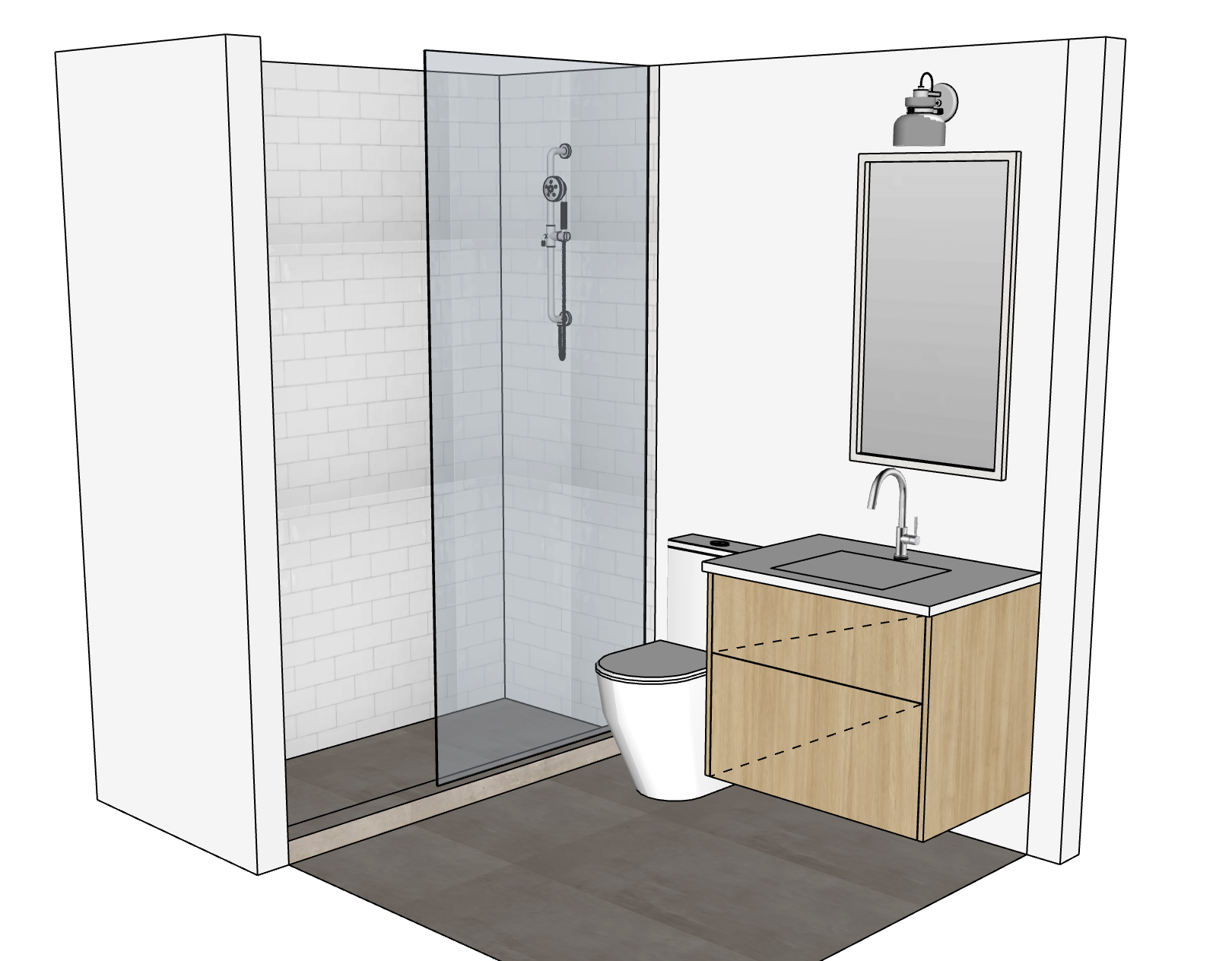 grey large format floor tiles grey large format shower floor tiles white subway shower wall tiles white oak flab slab vanity drawers white quartz countertop chrome plumbing fixtures