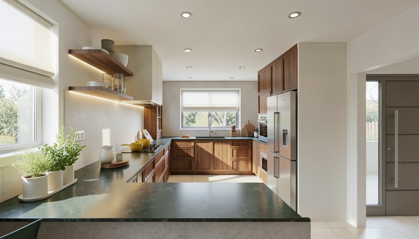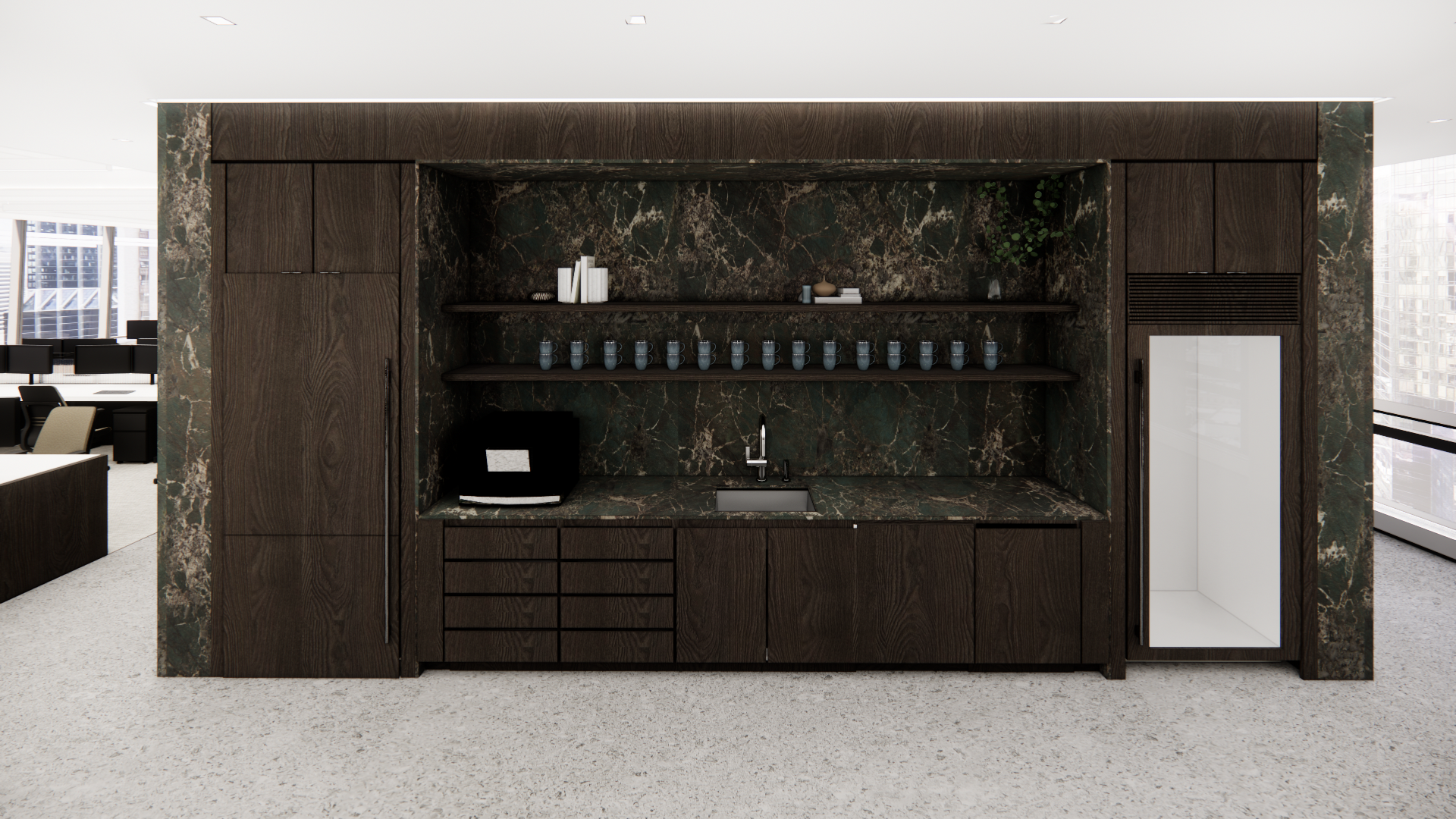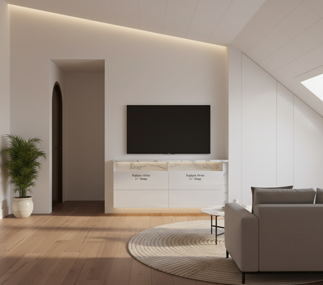 provide a photorealistic rendering keep all the elements proportions and materials as they are add linear light under the shelves