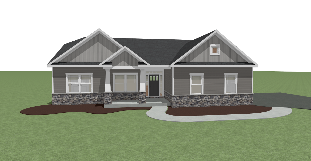 render this 3d image to appear photo realistic maintain all existing architectural materials and structural elements exactly as shown enhance the setting with a lush well maintained landscape include minimal beds manicured shrubs and a tree lined backdrop that frames the home naturally the windows should have a glossy finish with clear reflections of the surrounding trees and sky lighting should feel natural with soft shadows and realistic depth to bring the scene to life