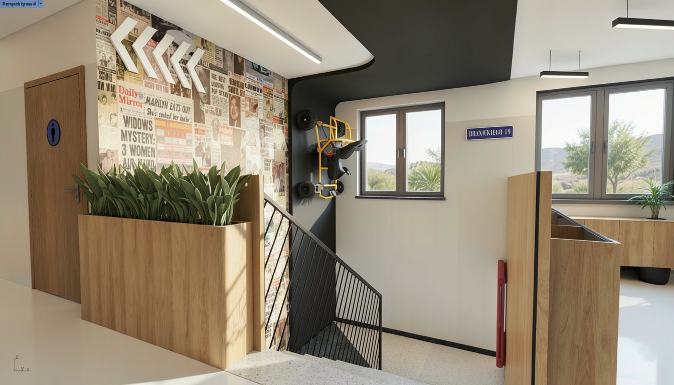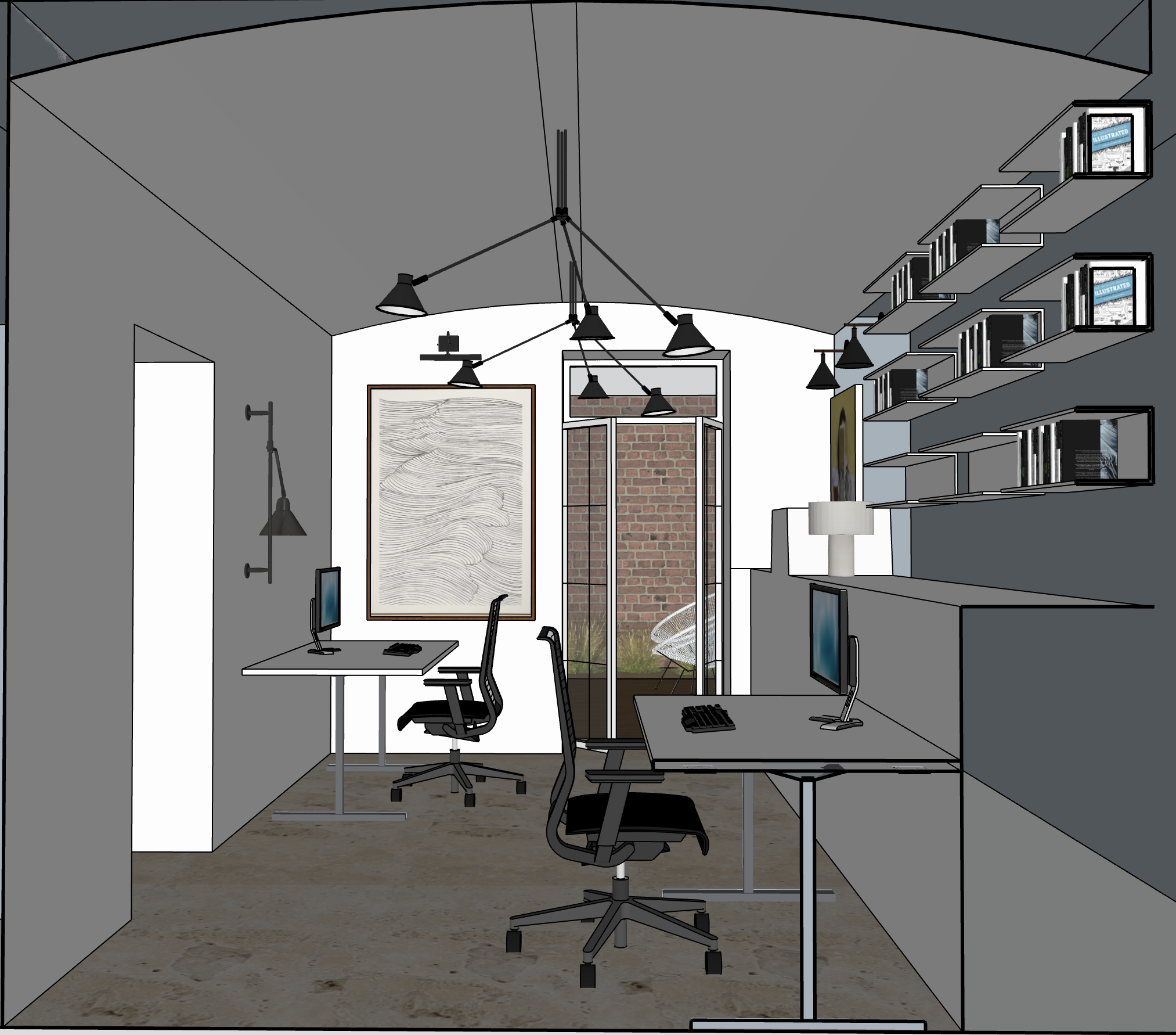a light and airy office space with white stucco walls and white stucco vaulted ceilings there are some green plants on the shelves there is a modern barn door on the left with no greenery behing the open french doors are leading into a private patio with some modern seating the floor is natural rough stone flooring covered by a large faded rustic rug there is only one french door to the left and there is large modern art piece as shown in model with modern black art light stay true to model as much as possible keep plants only on the open bookshelves on the right round the edges of the bulcky piece of wall to the left