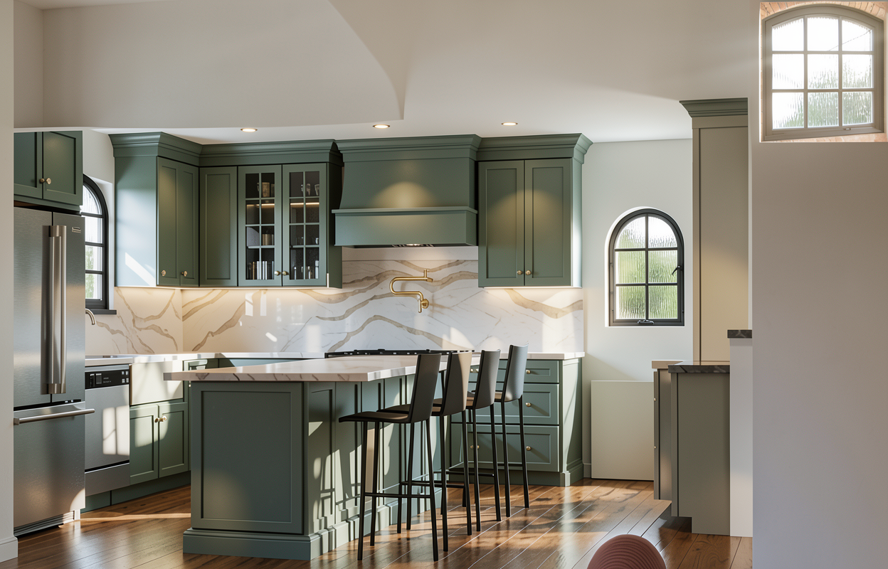 keep everything the exact same only change is make the one glass cabinet to the left have fluted glass