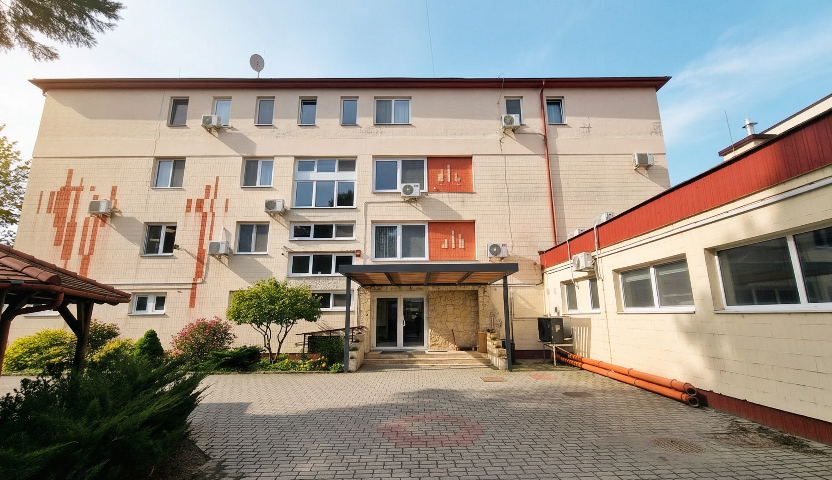 photorealistic architectural visualization of a hospital facade renovation modern sandstone cladding large curved designer entrance canopy with wooden underside and integrated led lighting glowing medical logo on the wall lush green landscaping with ornamental trees warm golden hour sunlight high resolution 8k