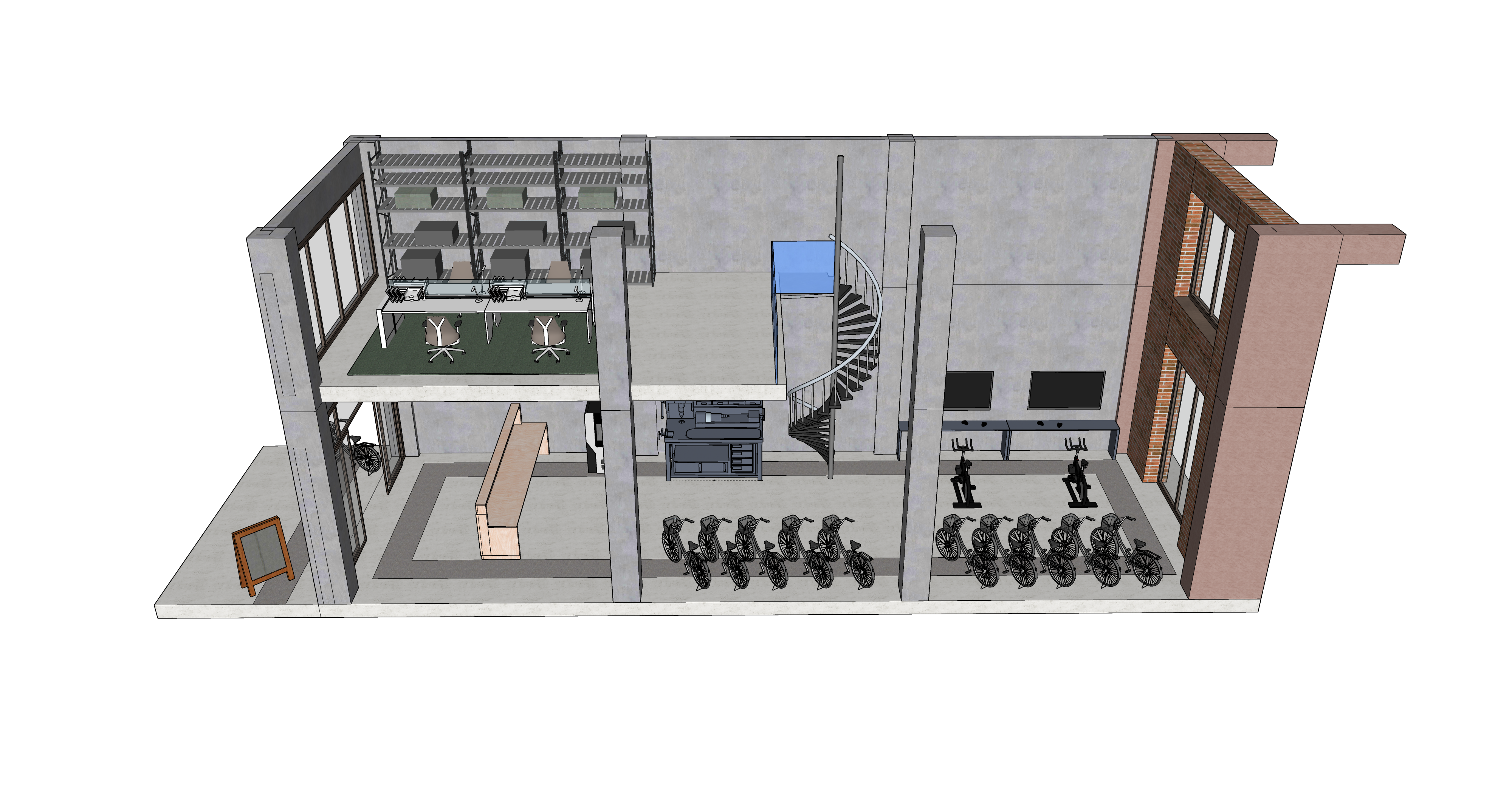 modernist perspective shot bike shop with signage bikes on ground floor with a stationary bike and vr head set experience top floor office level architecture