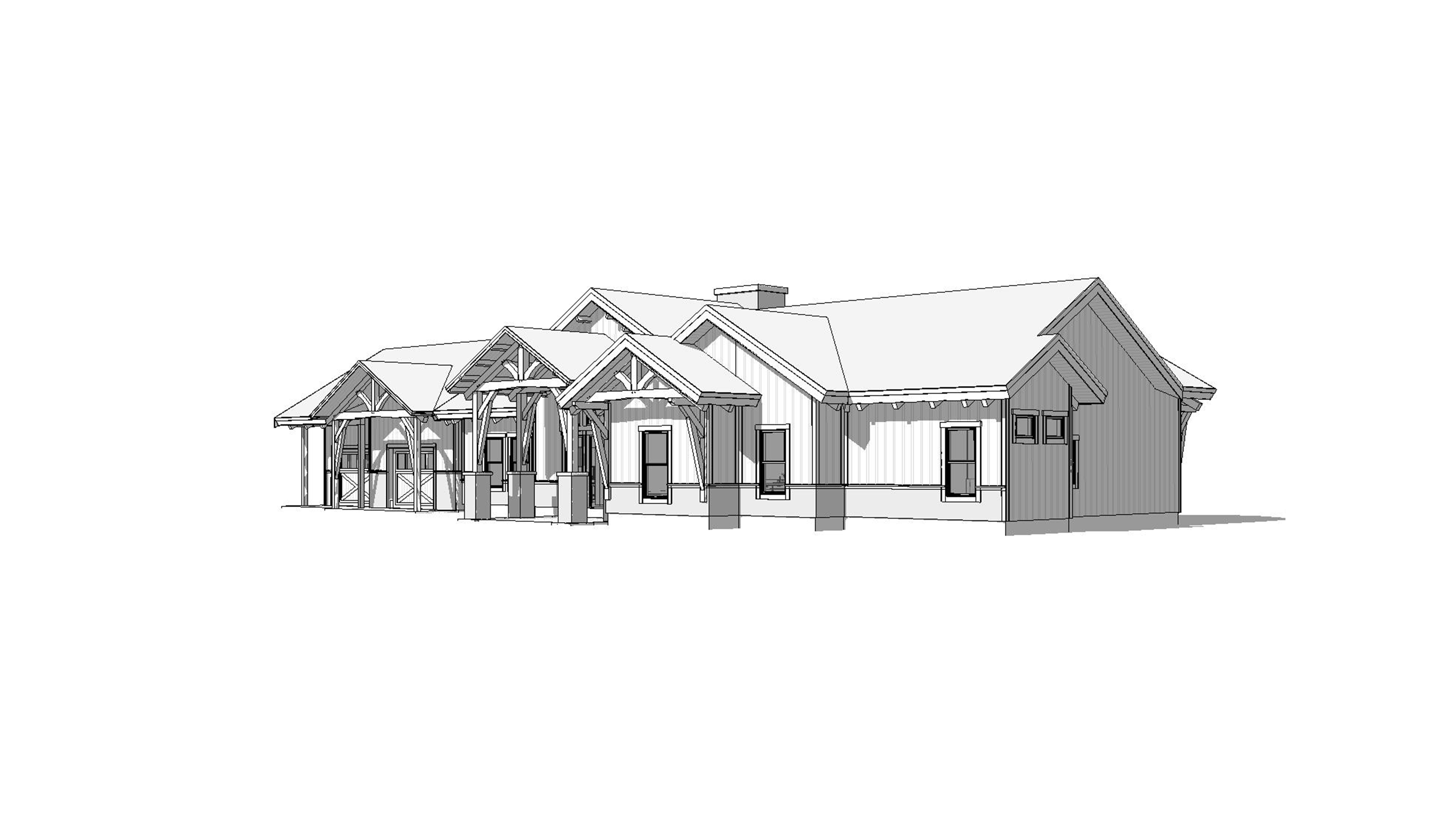 clean mountain modern timber architectural exterior rendered in cinematic vibrant mid morning lighting with blue skies and fluffy white clouds mountain modern with heavy timber architectural style select grade horizontal cedar wood siding beautifully lush green manicured landscape around structure with hedges and gardens black standing seam metal roof prominent cinematic northern california forest with big beautiful redwoods surrounding the house in the background high fidelity photorealistic visualization crisp shadow falloff refined facade geometry soft atmospheric depth premium architectural photography mood ultra clean composition and materials dark trim around windows concrete driveway leading up to the home and garage doors on the left portion of the house