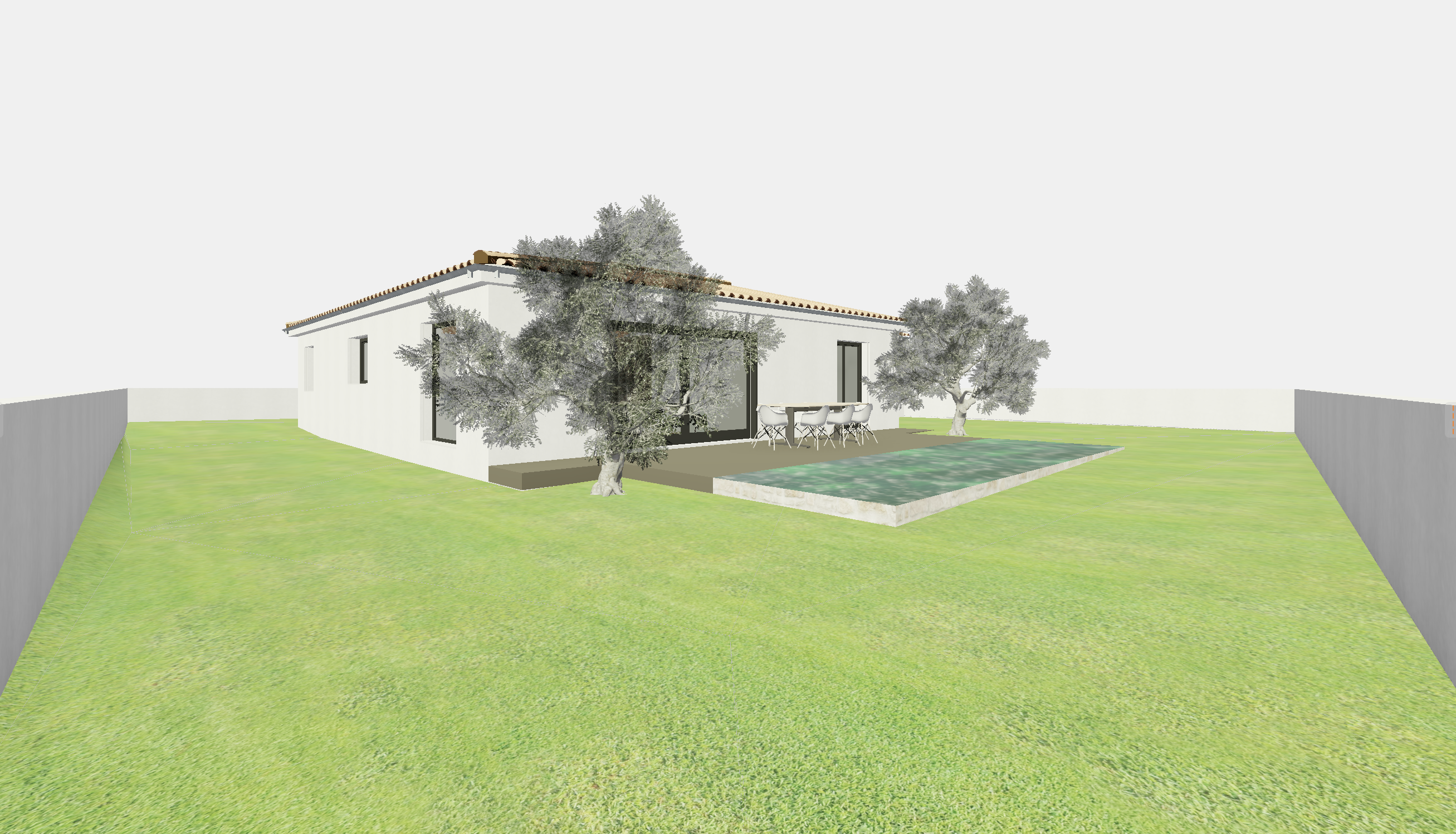 2 olive trees on each side of the terrasse and some mediterranean pine trees in the background add some palm trees and some lavender on the grass the plants are more organised there is a mix of lavender and other mediterranean plants