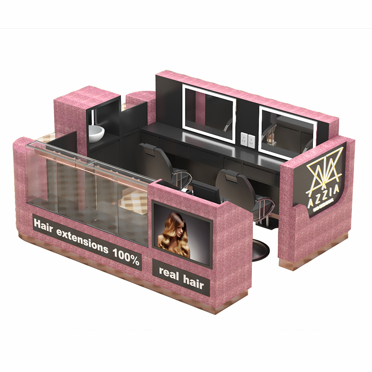 convert this picture of a beauty mall kiosk into a hairdressing shopping mall kiosk with designs based on portland usa