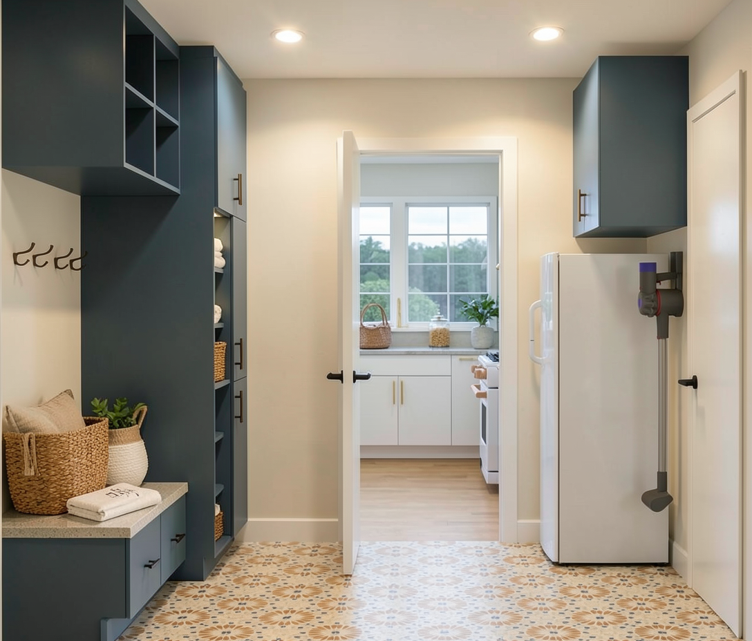 interior design photograph natural wood kitchen cork walls birch plywood shelves light polished concrete worktops and splashbacks brushed stainless steel sink and appliances cork parquet brick flooring and matt white plaster ceiling