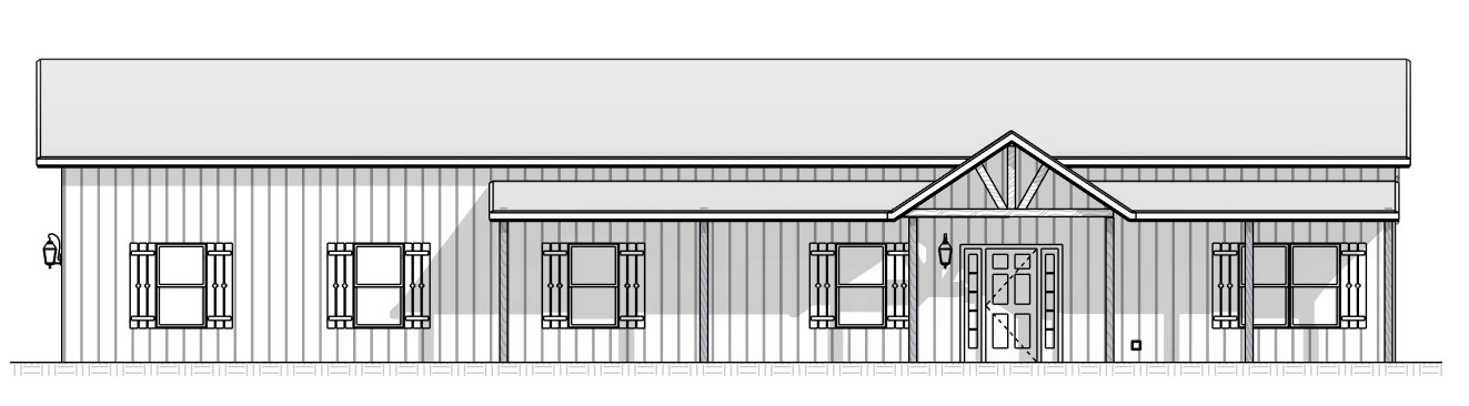 cream color metal vertical siding with a dark green roof natural wood color window trim shutters and door
