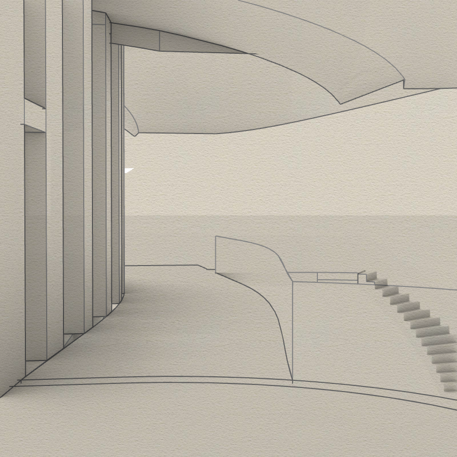 architectural watercolor rendering of a balcony view looking out with the building to the left and mountains and clouded sky to the right realistic materials background and edges dissolve into loose watercolor washes and white paper edges not full bleed with soft unfinished fade around the image visible pencil and ink linework with light technical annotations artistic yet grounded balance of precision and painterly abstraction calm morning light concept architectural visualization style