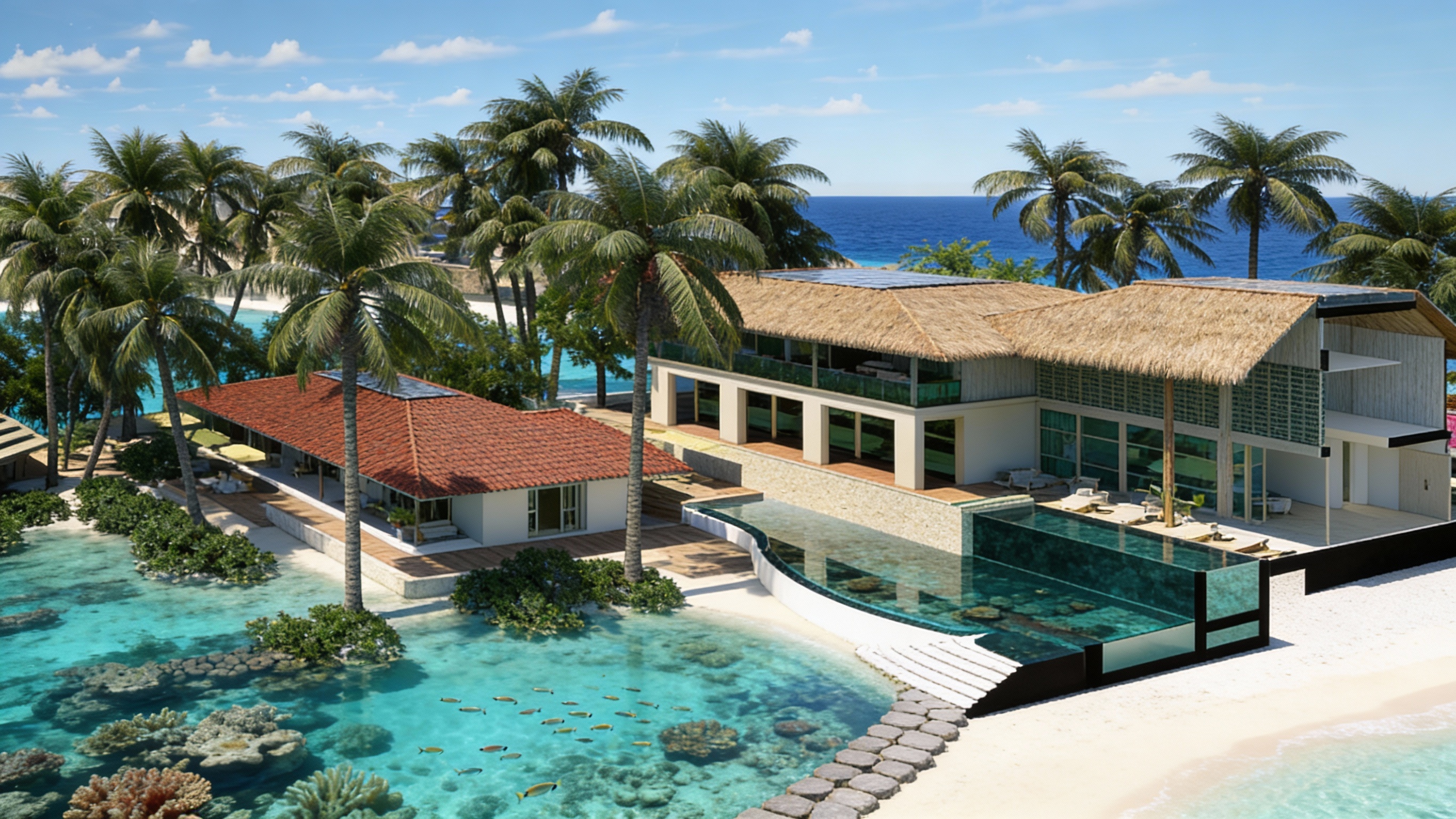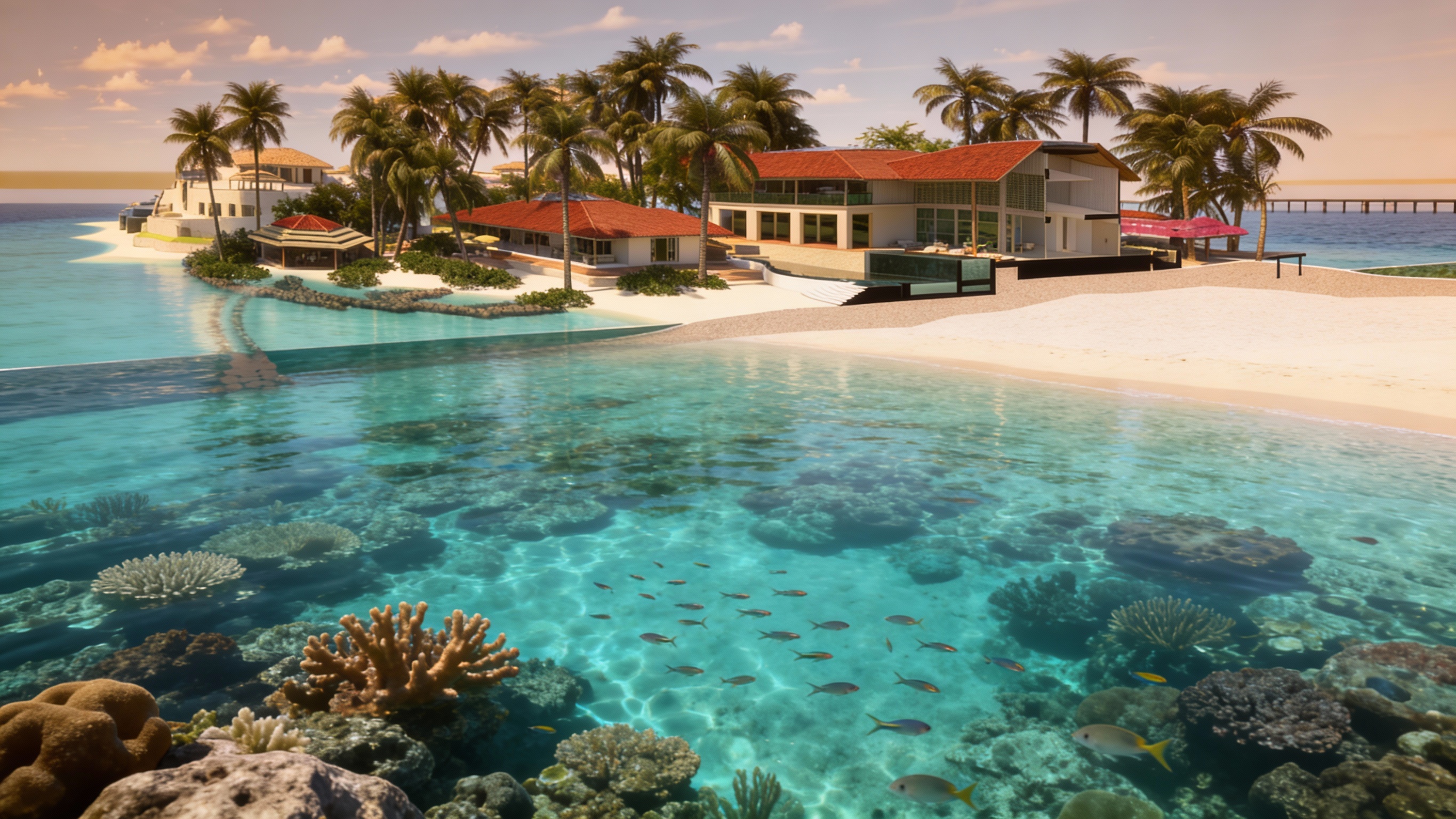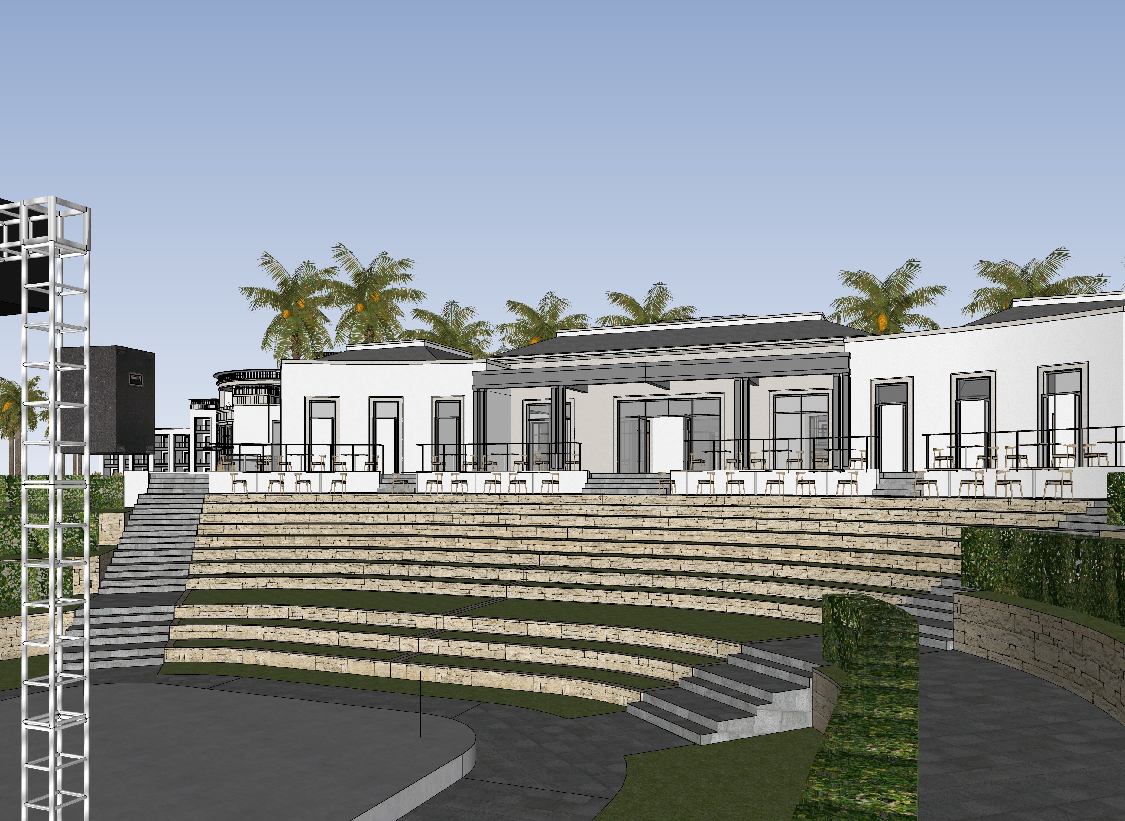 evening view with lights on inside the restaurant fill the amphitheater seating with people and kids dressed in casual resort clothes add some people walking up and down the amphitheater steps enhance the landscaping add some lighting on the stage in the foreground put some musicians performing on the stage with musical instruments and other performance equipment add spot lights on the stage performers add people sitting at tables on the top level of the theater next to the restaurant building with drinks on the tables watching the stage add a moon in the sky in the upper left corner of the view make the hedges more natural and realistic looking