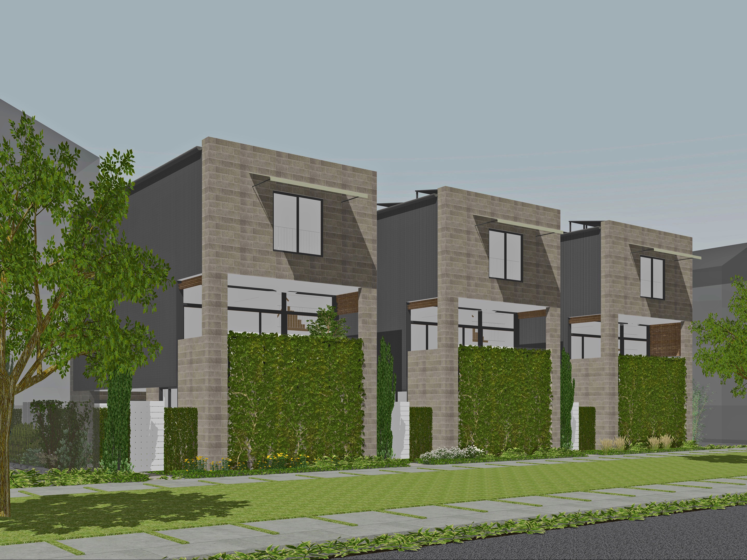 masonry at front is standard cement blocks material on sides is vertical metal siding there are awnings above the upper windows