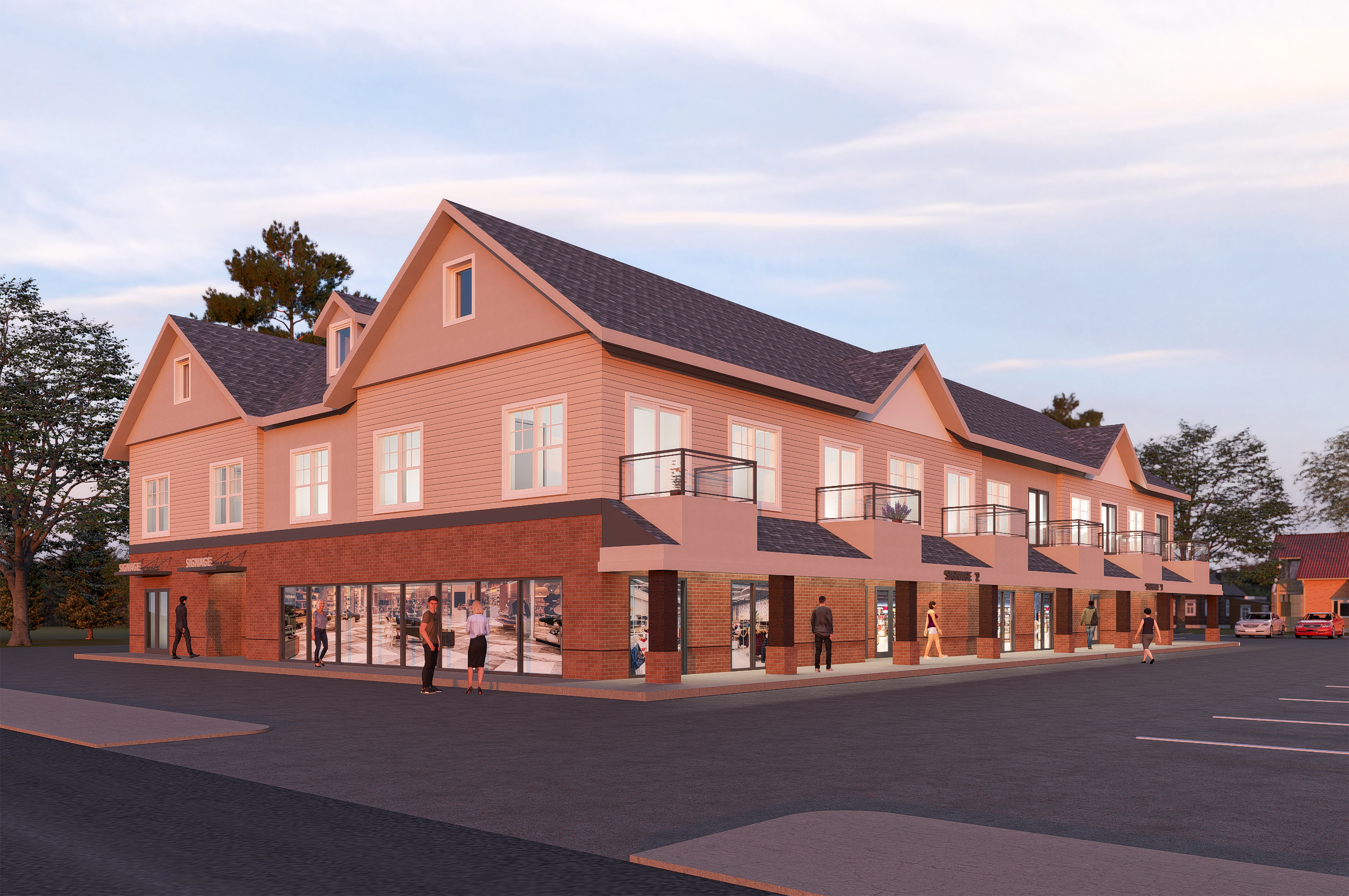 render keeping the volume colors textures and create a dynamic and lively picture with people cars lights coming form inside the building daylight view