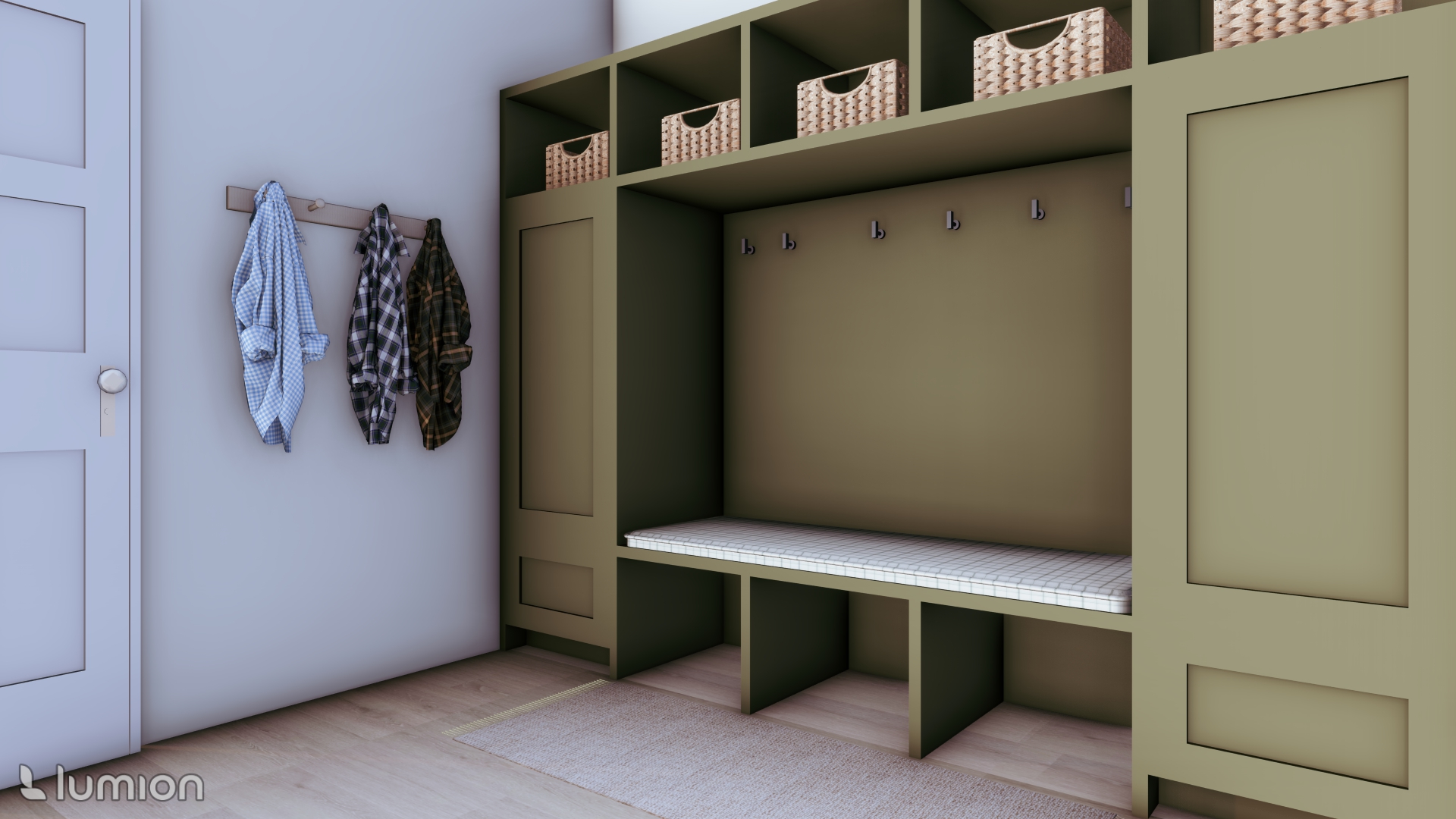 this is an already rendered picture of a family home add realistic textures to the surfaces without changing the colors or anything else add realistic clothes from the hooks do not add anything else