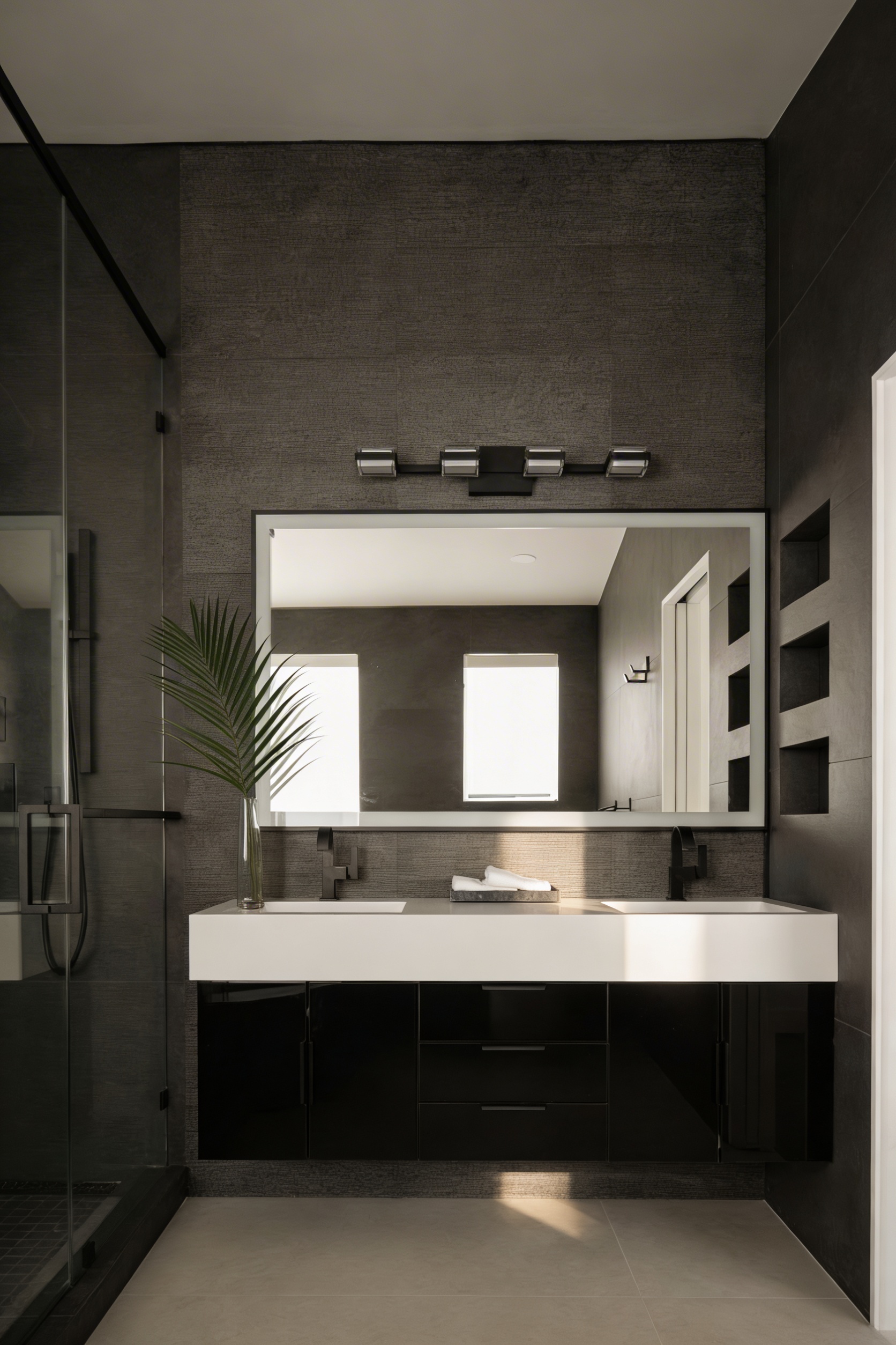 use the provided image as the exact design reference maintain the same layout materials fixtures colors and proportions do not redesign or replace elements transform the image into a luxury interior magazine editorial bathroom scene with softer moodier coloring and elevated professional lighting lighting should feel calm and atmospheric soft diffused natural light gentle shadow gradients slightly dimmed highlights for a spa like ambiance warm neutral undertones no harsh white lighting subtle reflective glow on stone tile and metal finishes apply editorial color grading slightly desaturated tones warm gray and taupe balance soft contrast with muted highlights creamy whites instead of bright whites cinematic tranquil spa mood enhance realism refined material textures stone plaster metal glass natural reflections and depth soft fabric and surface realism without over sharpening styling should feel minimal curated and high end luxury spa inspired remove visual harshness or overly bright areas camera should resemble a professional architectural photography shoot eye level perspective balanced composition subtle depth of field final image should feel serene sophisticated slightly moody and publication ready similar to an architectural digest or elle decor bathroom editorial add minima bottle styling to shower niche and banana leaves in a glass vase by jacuzzi