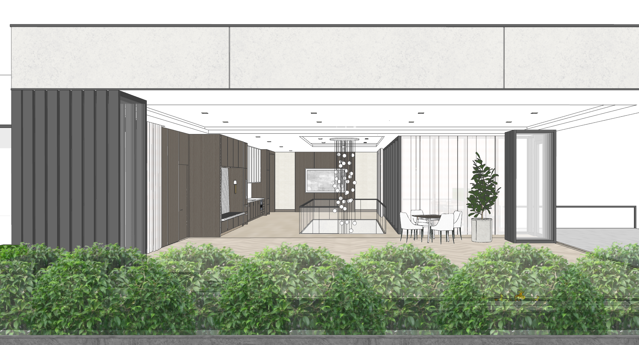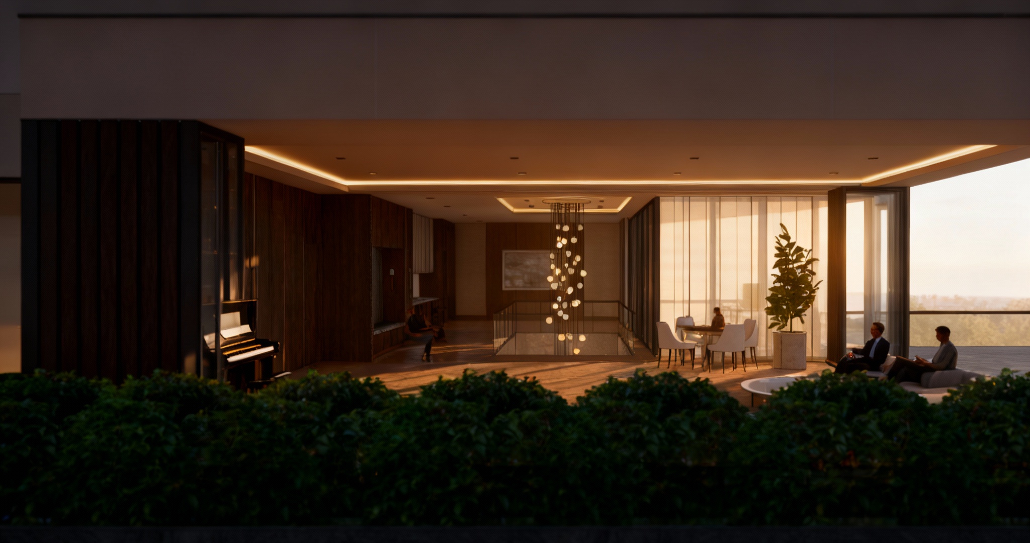 render this luxurious rooftop penthouse in the afternoon letting in natural light all interior lighting and ball chandelier to be lit and illuminate the interior have cove lighting at recessed tray ceilings have a few upscale business people lounging in the interior space