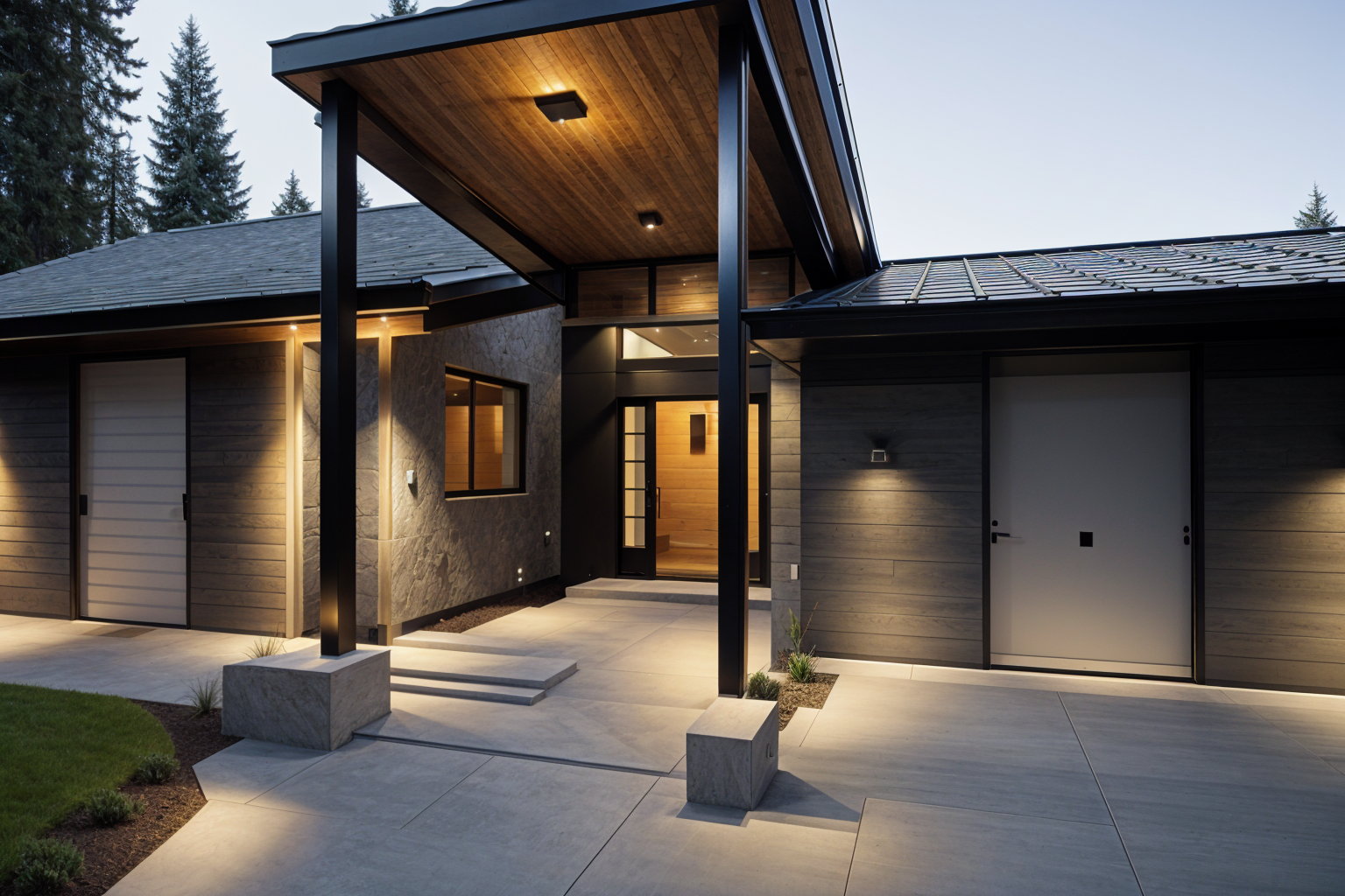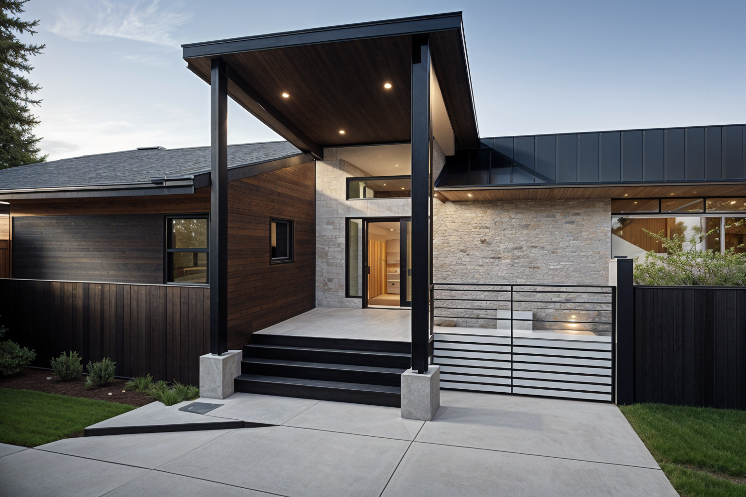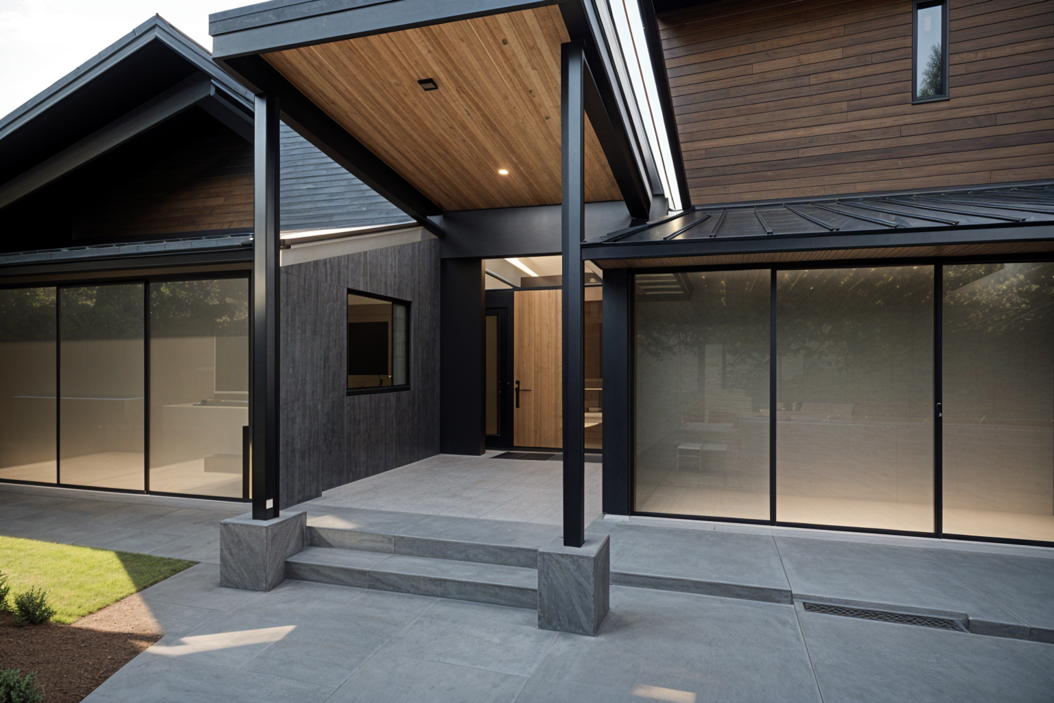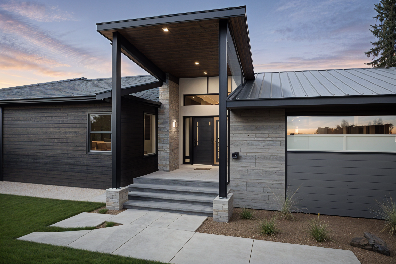 black roof black windows black garage doors with grids white smooth stucco walls line stone accent