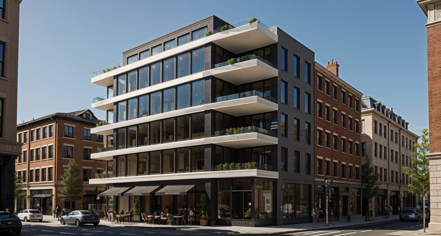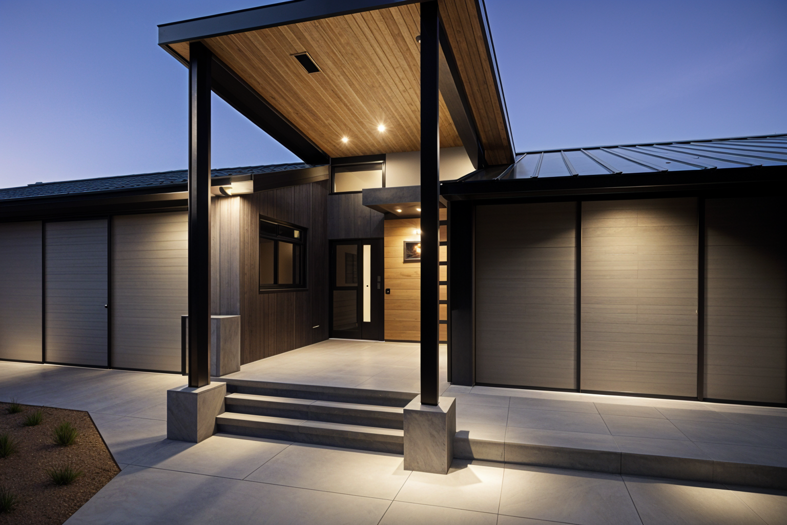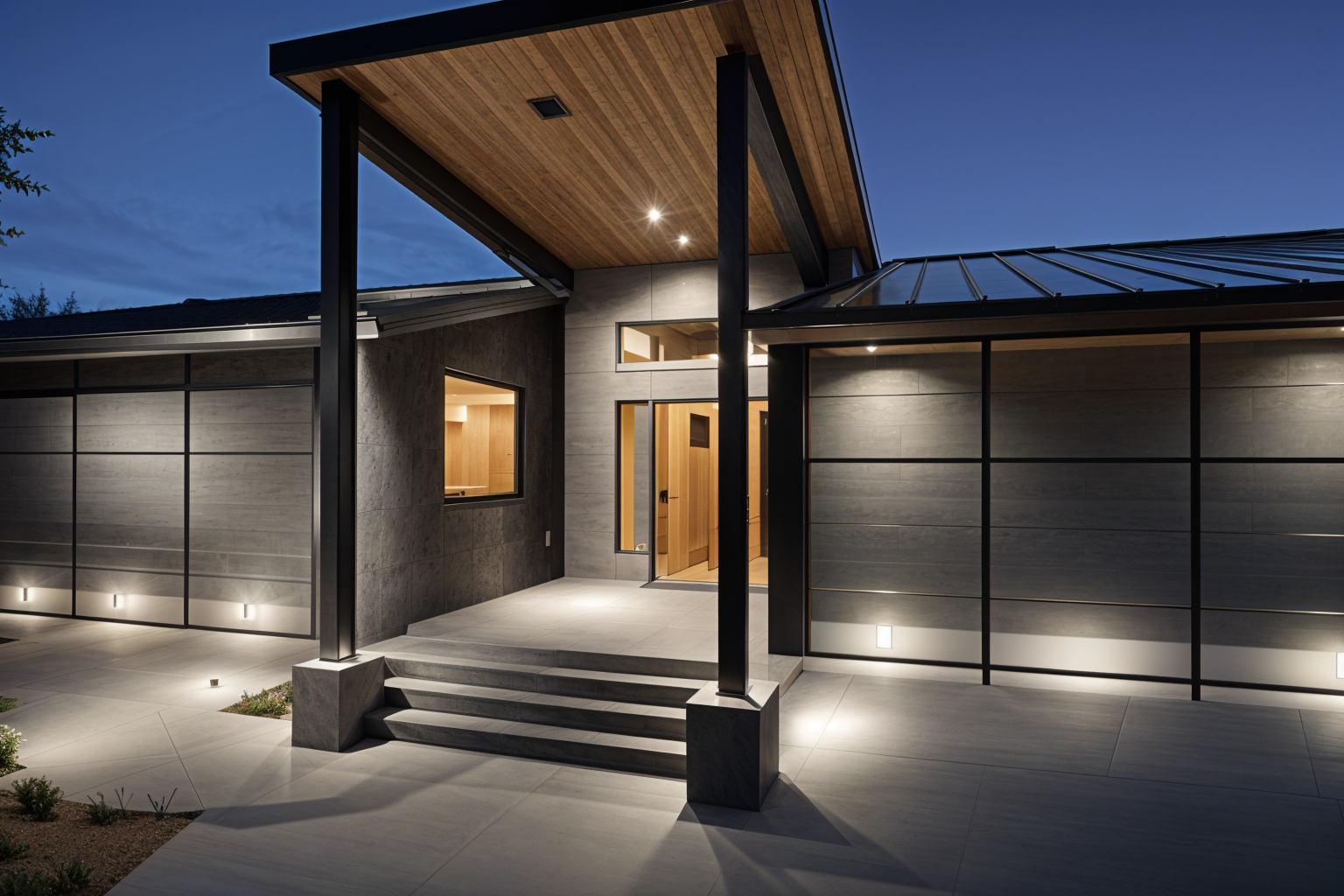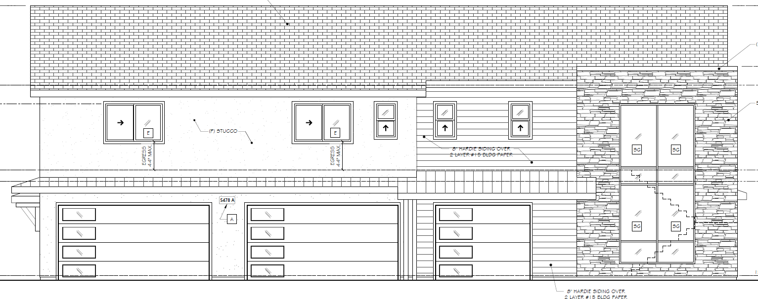 black roof black windows black garage doors with grids white smooth stucco walls line stone accent
