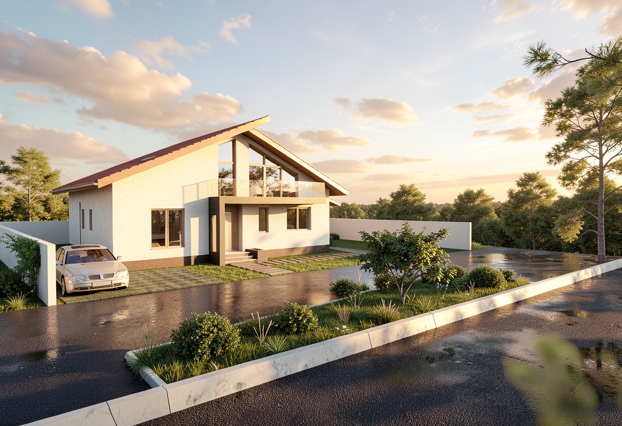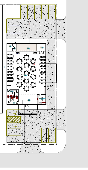 i need an eye level of rendering of the building based on the floor plan provided the building has to comtemporary 1 story show plenty of people cars and landscape and