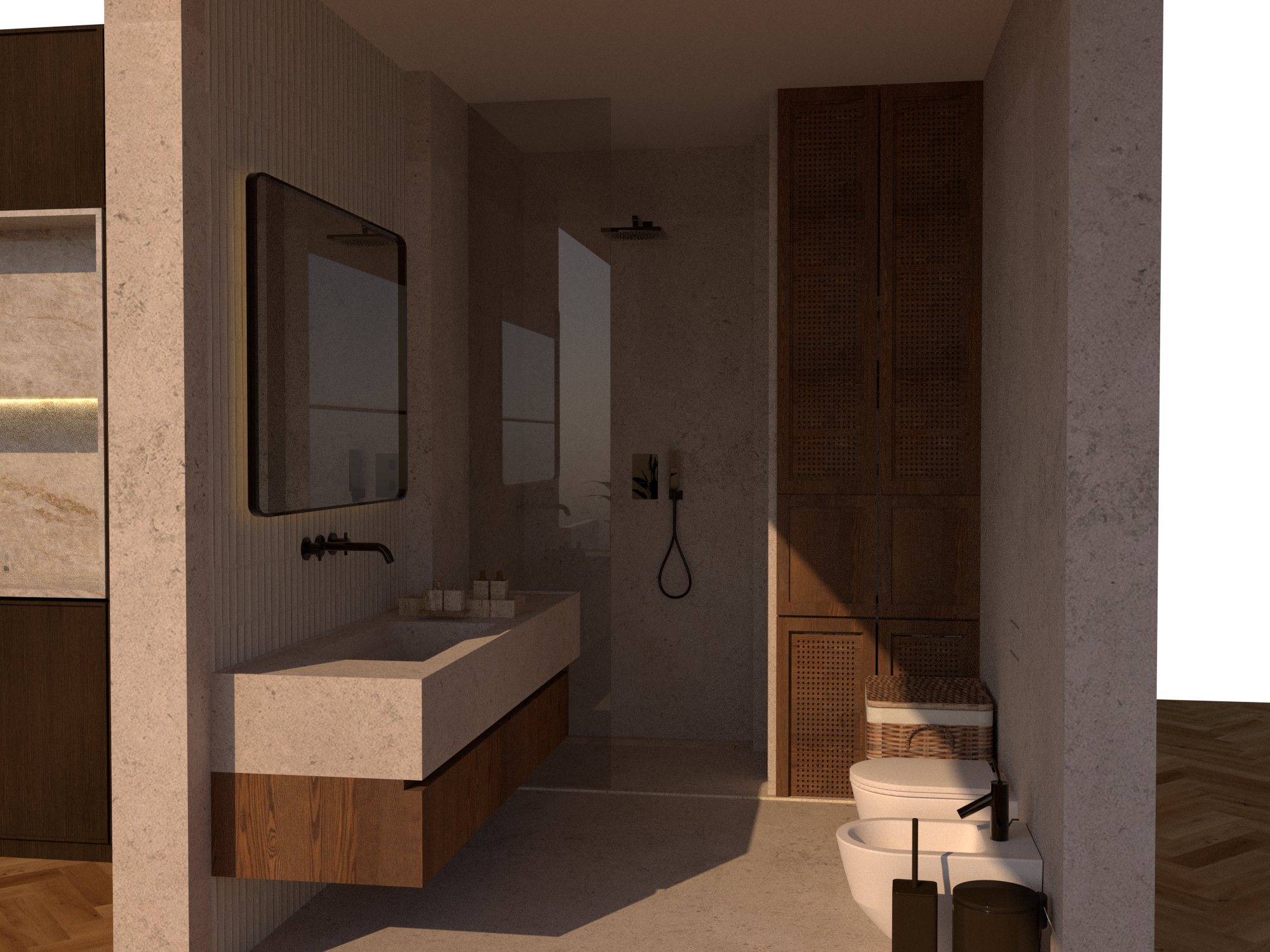 contemporary luxury bathroom interior minimalist spa like design large format warm grey stone tiles with subtle texture on walls and floor floating wooden vanity in natural oak finish with integrated drawers topped with a smooth matte white oval vessel sink black matte wall mounted faucet and shower system with rain shower head walk in shower with frameless glass and recessed niche shelf soft warm led lighting integrated behind the mirror and in vertical wall recesses creating indirect ambient light neutral decorative elements dried branches minimal accessories calm elegant atmosphere high end residential bathroom ultra realistic architectural visualization photorealistic materials accurate scale and proportions soft shadows global illumination cinematic lighting 4k quality