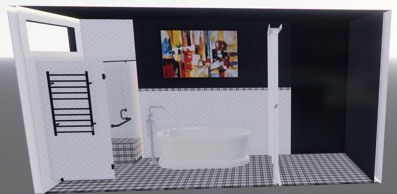 make this rendering into a real photo preserve the material colors patterns scale and dimensions don t change any geometry include micro detail finishes add one 58 year old woman to embellish the scene add a small oval fluffy dark red rug in front of the tub add a towel hook in polished nickel to the wall behind the tub and place a red silk robe hanging on it the doors opposite the shower should be a medium brown wood with a raised panel style doors add two 2 recessed cans where the ceiling lights are located the tub filler should be polished nickel finish add trim around the perimeter of the window above the shower include a small wood stool just to the left of the tub