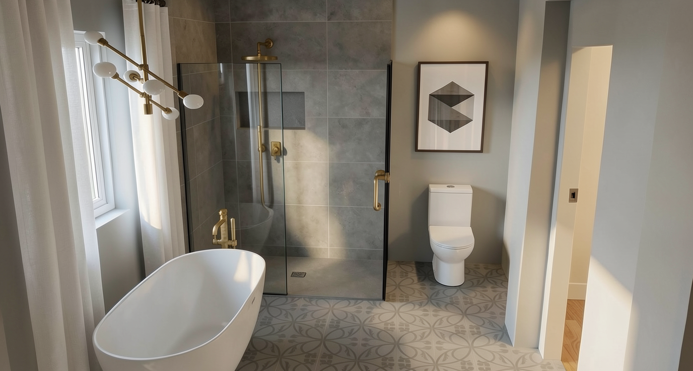 a modern two story house with large windows and a flat roof the house exterior is finished in crisp white with sleek black window frames the picture shows the front yard with driveway and the side elevation the house is situated on a corner property with a street in front and on the right side of the picture the property has a half level slope between the front and backyard