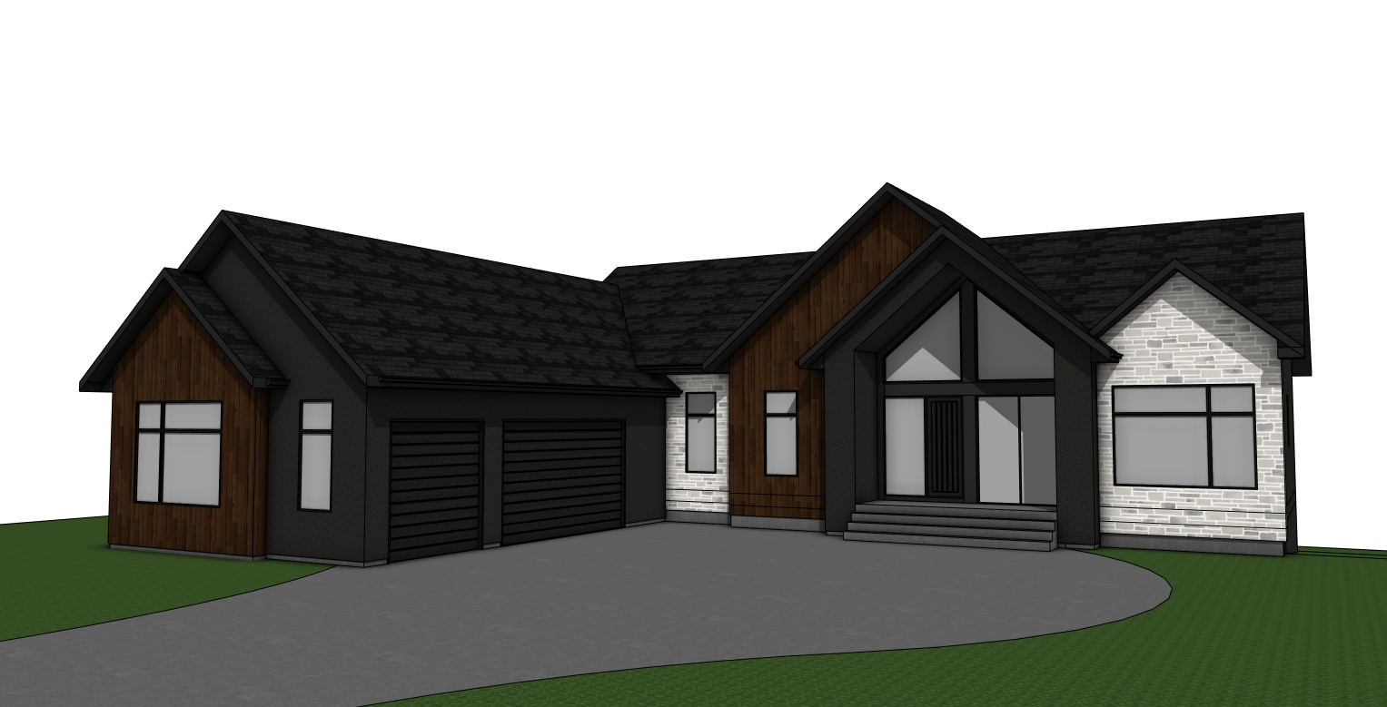 house is backing on to the red river in winnipeg manitoba there are lots of oak and elm trees in the background behind the home add some landscaping to the front yard small subtle flowers and shrubs dark exterior material is acrylic stucco borwn material is wood look siding and the light material is limestone