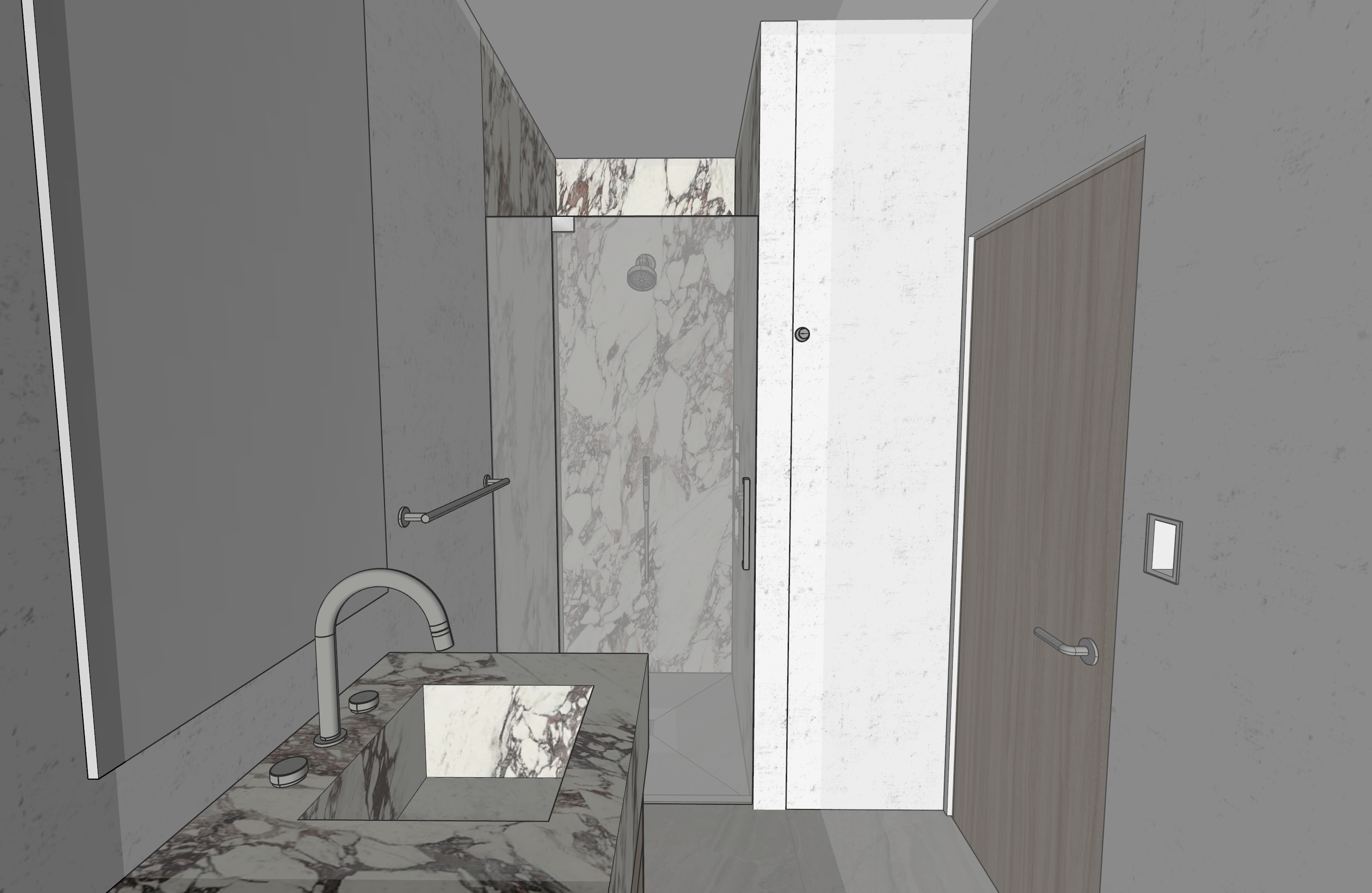 relaxing atmosphere mirror is backlit floor is limestone shower walls and countertop is calacatta borghini
