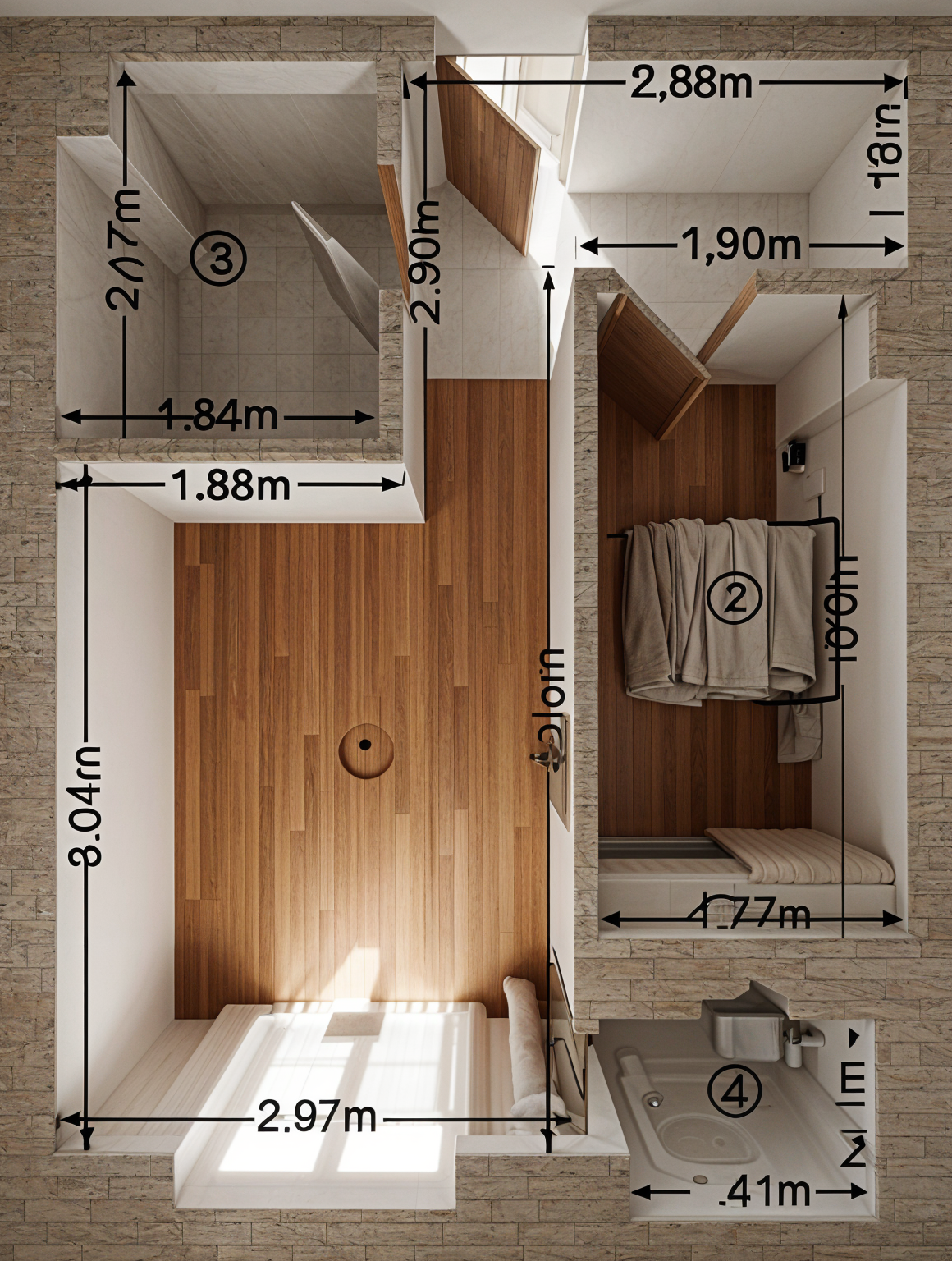 millwork in light oak color neutral travertine texture large format flooring microcement walls in neutral color