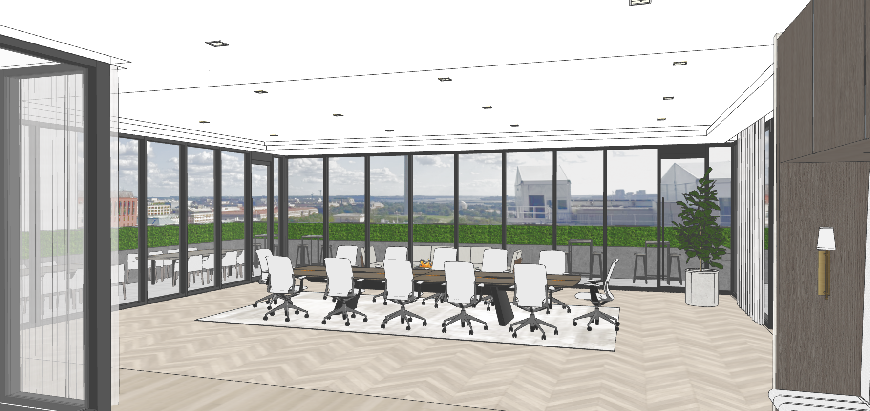 luxurious penthouse overlooking the washington monument high end conference room with a few business people interacting the space all lights to be turned one with cove lighting in the recessed tray ceiling lighting flowing into bright space realistic sky and illuminated interior space make sky dusk