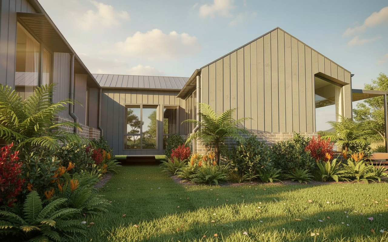 a manicured lawn natural australian ferns shrubs layered flower beds low maintenance shrubs native plants ghost gums stringybarks in background