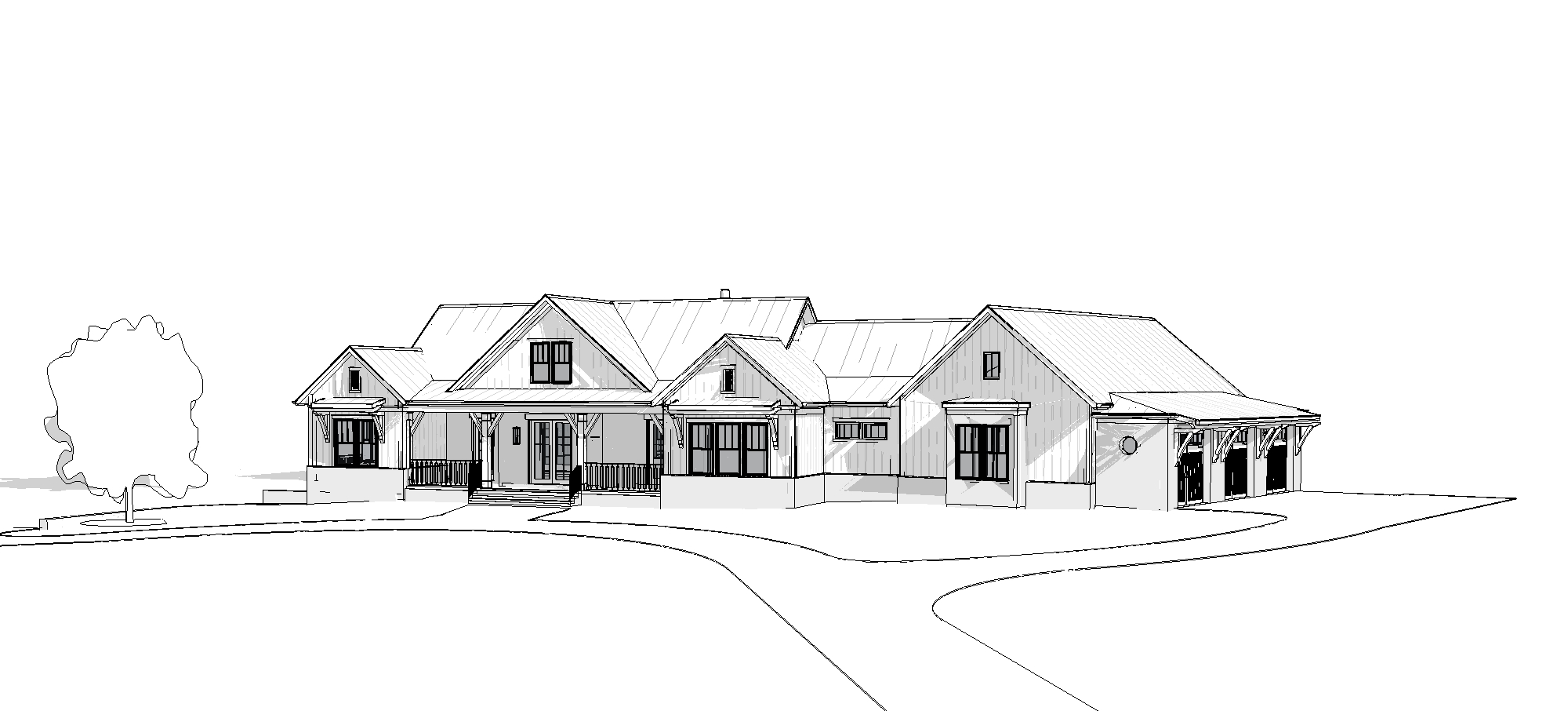 create scene with this house on a wooded setting the house is a combination of white painted brick and white board and batten siding the timber columns and timber framing are stained walnut the windows are black the garage doors are stained walnut there should be low landscaping along the driveway and sidewalk leading to the front porch the roof is black standing seam metal show the scene just before dusk and turn the lights on as well as add landscape lighting