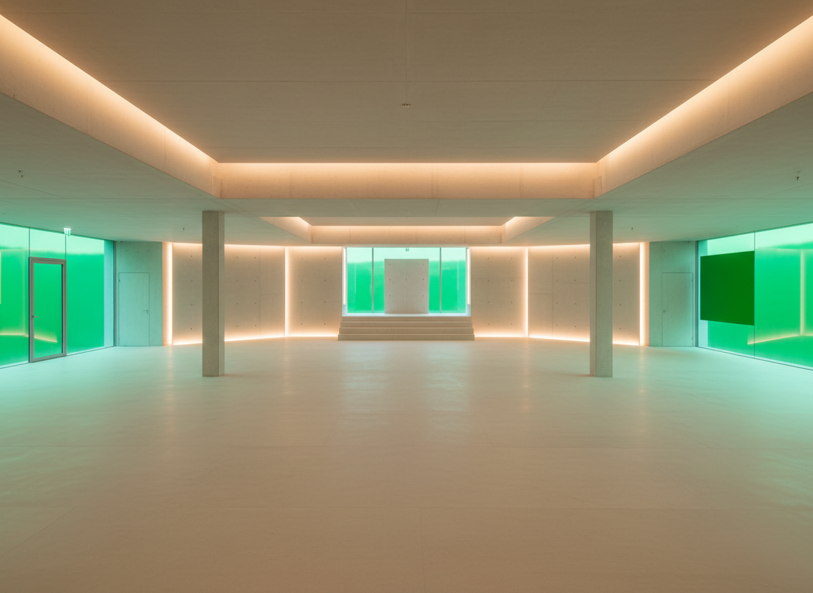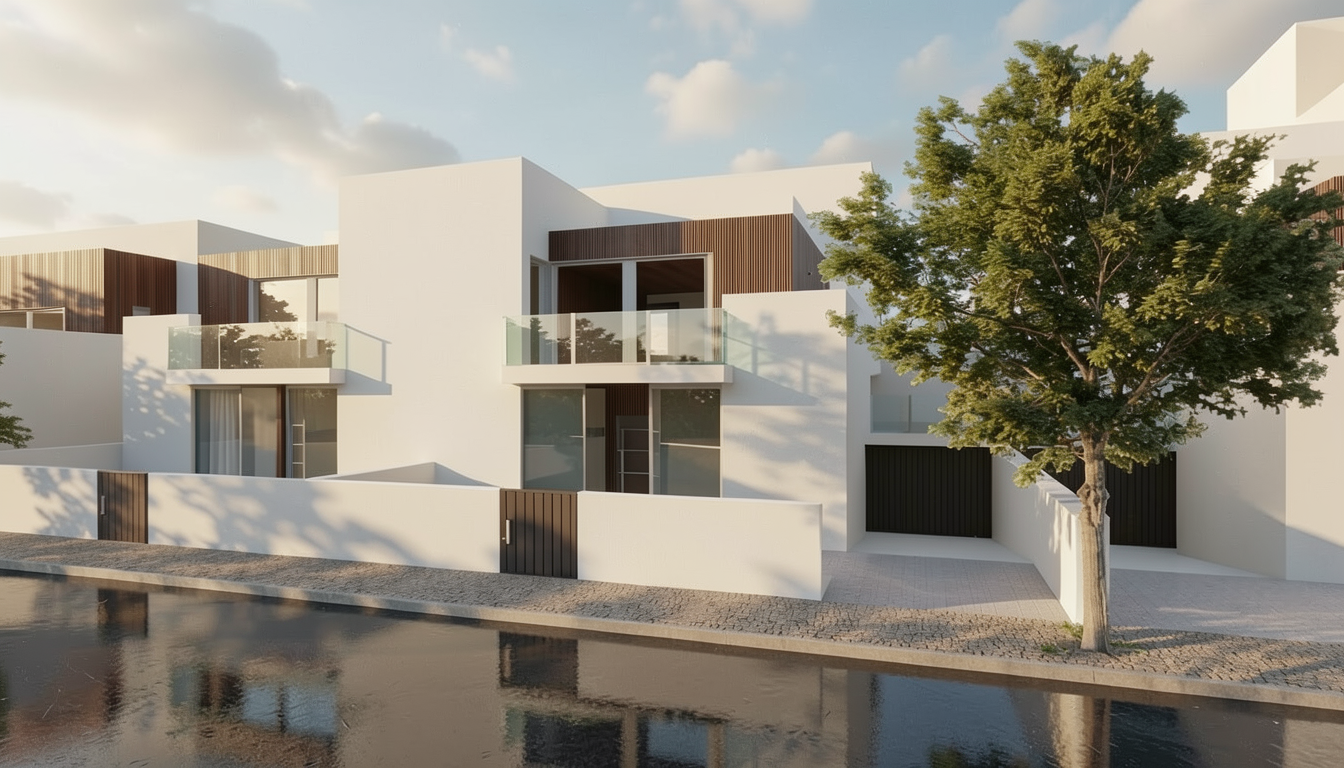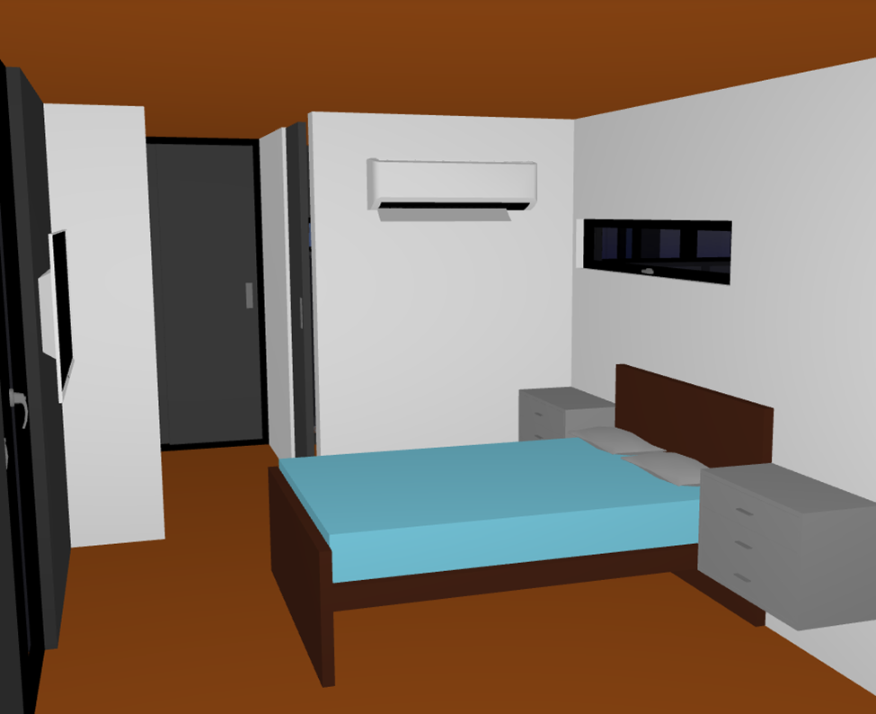 this is a guest suite in a home the bed should have a fluffy comforter with comfortable pillows the ceiling and the floor should both be in a reddish brown walnut plank golden hour lighting from the windows on the left as well as the windows from behind the camera