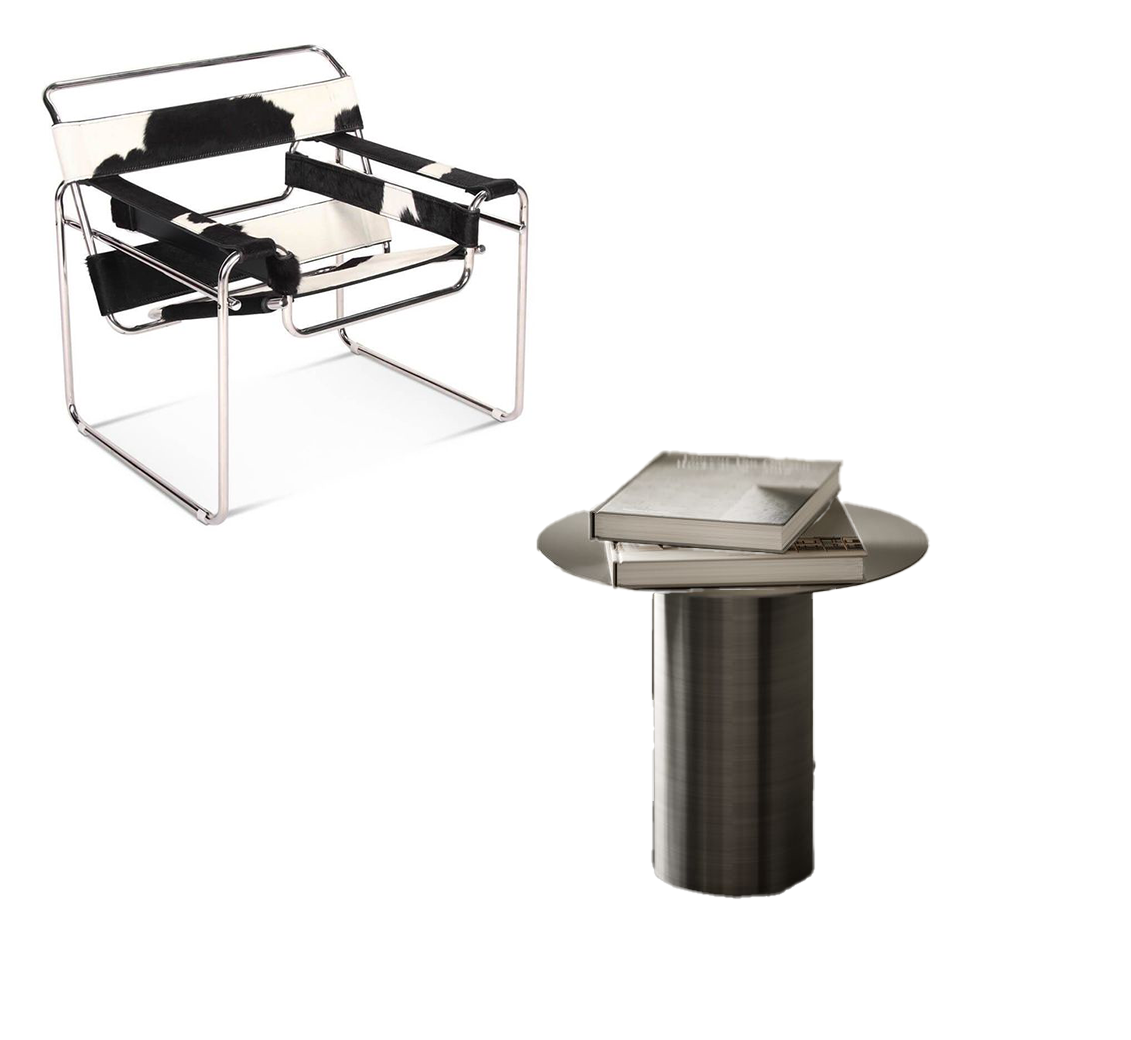 exterior shot use moodboard references strictly for object and material transfer only preserve original image completely same camera composition framing geometry lighting and shadows no crop no zoom no reframing apply only these changes 1 wassily chair keep exact geometry from original scene replace material using reference chair material black and white cowhide short natural fur soft tactile surface visible hair direction clean bold pattern not fragmented balanced black white contrast armrest straps smooth matte black leather frame highly polished chrome sharp reflections 2 coffee table add exact table from reference geometry round top single cylindrical pedestal base slightly thick top clean edge material brushed stainless steel visible vertical brushing texture soft satin reflections not mirror placement position directly in front of sofa closer to sofa than center of rug slightly offset not centered aligned naturally with seating area no objects on table important do not modify any other furniture do not change dining area or kitchen do not restyle scene ignore lighting and composition from moodboard images use only original scene lighting