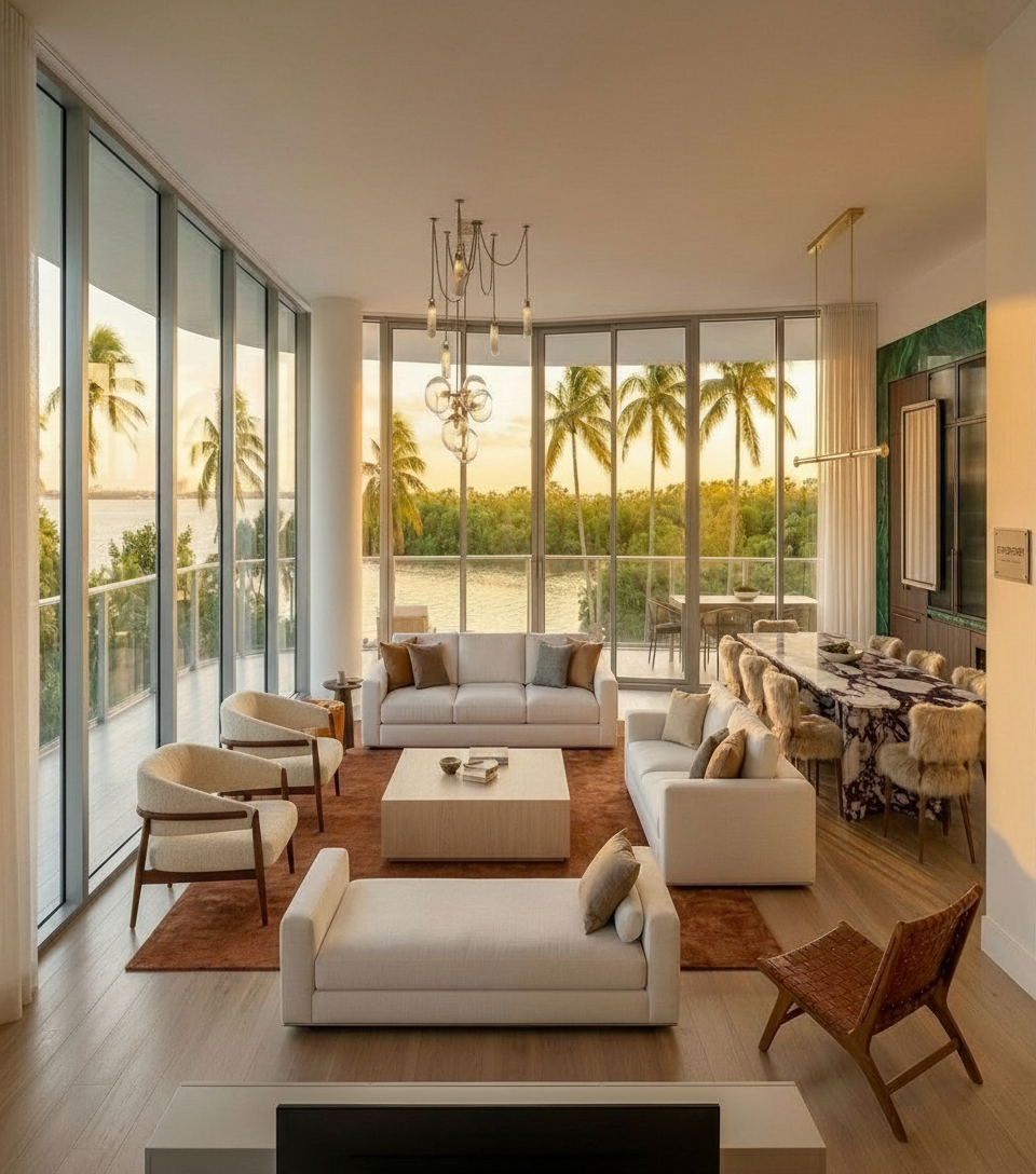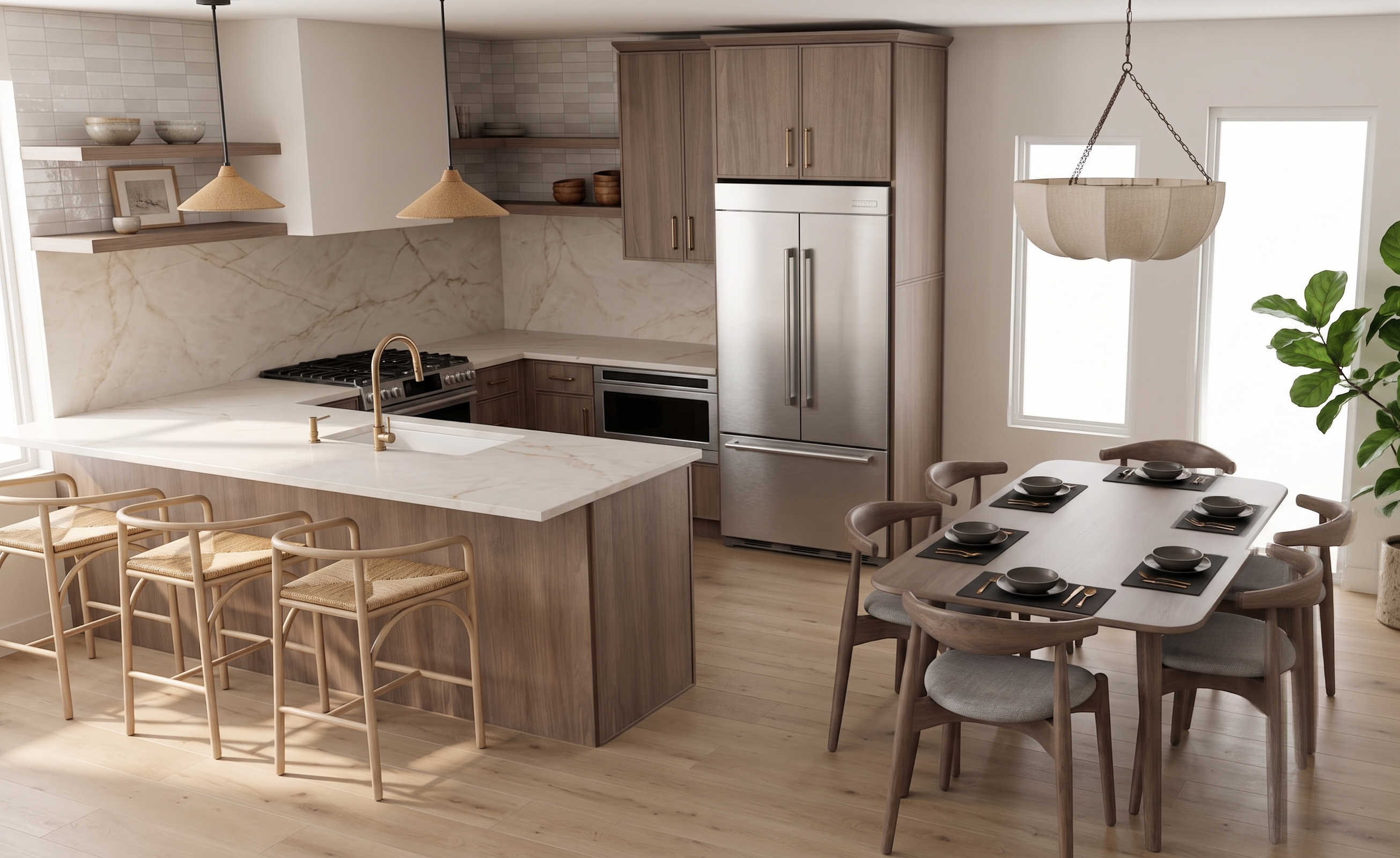 ultra realistic interior rendering of a warm contemporary primary bedroom feature wall with a centered fireplace and custom millwork symmetrical composition with floor to ceiling rift sawn white oak in vanilla stain cabinetry flanking a plaster fireplace surround cabinetry features vertical grain soft matte finish minimal brass hardware and integrated drawers below a large flat screen tv is mounted above the fireplace perfectly aligned fireplace is finished in a cast concrete in soft white finish with subtle tonal variation surrounding a firebox filled with charcoal fire spheres interior firebox lining has a slate grey split herringbone texture flames are natural gas low and ambient to the left a built in window bench with matching white oak cabinetry sits beneath a window with a textured roman shade in a warm neutral fabric to the right a flush wood door in a darker walnut tone adds contrast flooring is wide plank walnut natural hardwood in a medium warm tone with visible grain and satin finish transition detail important where the cabinetry platform meets the wood flooring include a refined tile inlay strip using cl zellige baguette tile gloss finish with 24k gold glaze dimensions 2 x 6 x 3 4 laid in a vertical pattern as a decorative threshold band tile should feel handcrafted with slight variation subtle reflectivity and imperfect edges catching light naturally lighting is soft indirect and architectural recessed ceiling lights with warm 2700k temperature gentle wall wash enhancing plaster texture subtle under cabinet shadowing for depth style should feel elevated editorial and timeless architectural digest aesthetic highly detailed materials realistic imperfections accurate light bounce soft shadows and natural color grading camera straight on elevation eye level 35 50mm lens rendering quality ultra realism ray traced lighting global illumination soft reflections micro texture detail