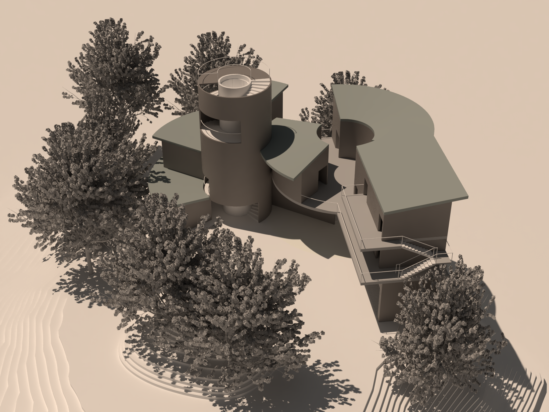 architectural watercolor rendering of a small contemporary research station perched on a rocky cliff structure made of warm wood black steel and glass precise and realistic architectural detailing cantilevered over stone terrain supported by steel beams surrounded by mountain pines and mist below rendered with crisp building geometry and realistic materials background and edges dissolve into loose watercolor washes and white paper edges not full bleed with soft unfinished fade around the image visible pencil and ink linework with light technical annotations artistic yet grounded balance of precision and painterly abstraction calm morning light concept architectural visualization style