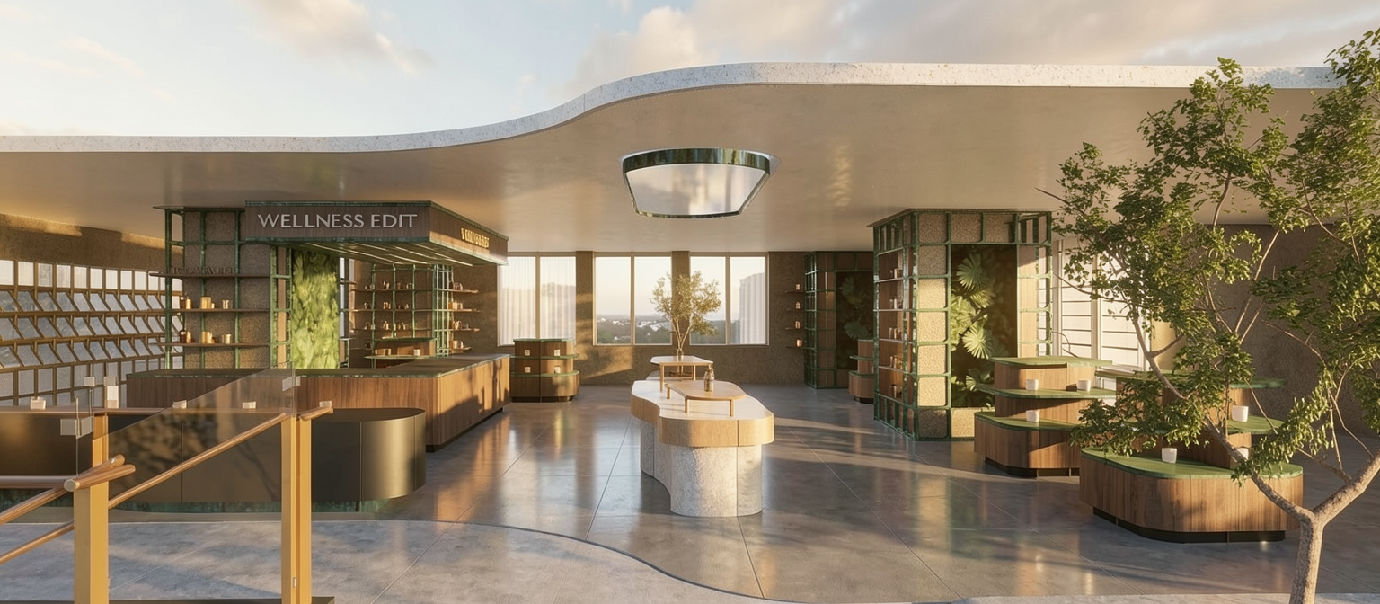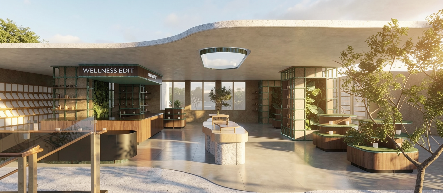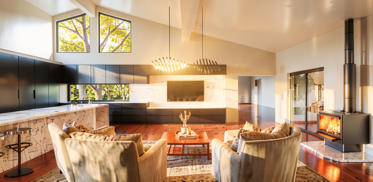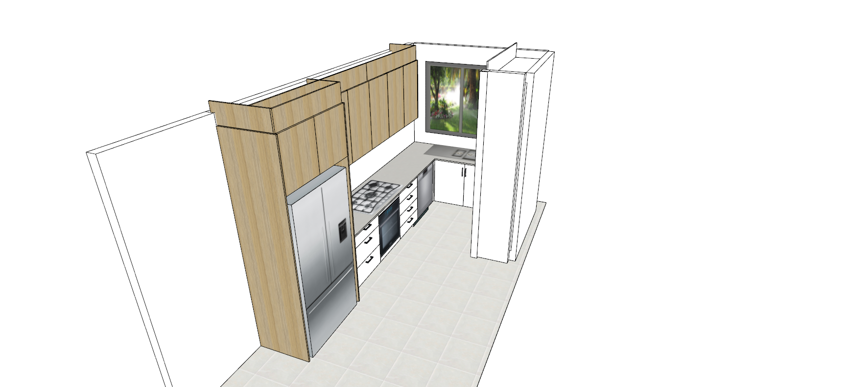 white flat panel cupboards with natural oak sections benchtop to be a light grey concrete show some sunlight