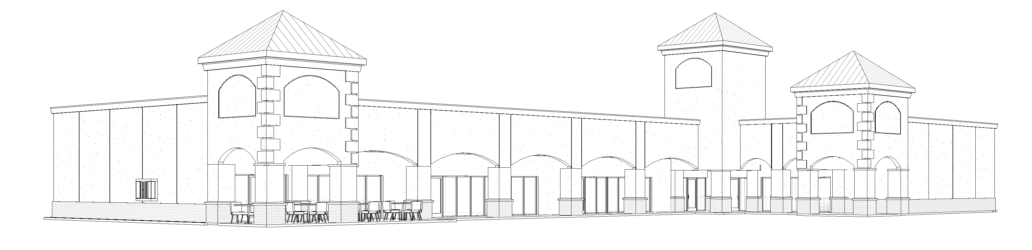 red brick column base and lower walls roof chnage to red spanish clay tile walls are lighy tan stucco the rim work at top roof edges top of brick base and the trim just under the clay tile the indows are dark bronze show light shadows at porch show a fewpeople setting at tables tables and chairs are black metal show three or four people walking in the porch areas the foreground is paving the arch elements on the towers are recessed 2 inches show a car approches the drive up window on the left end blue sky with clouds realistice view