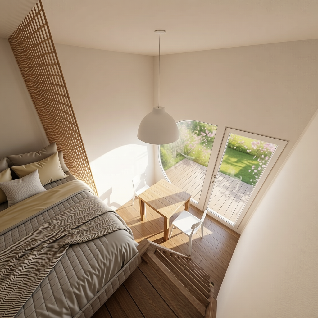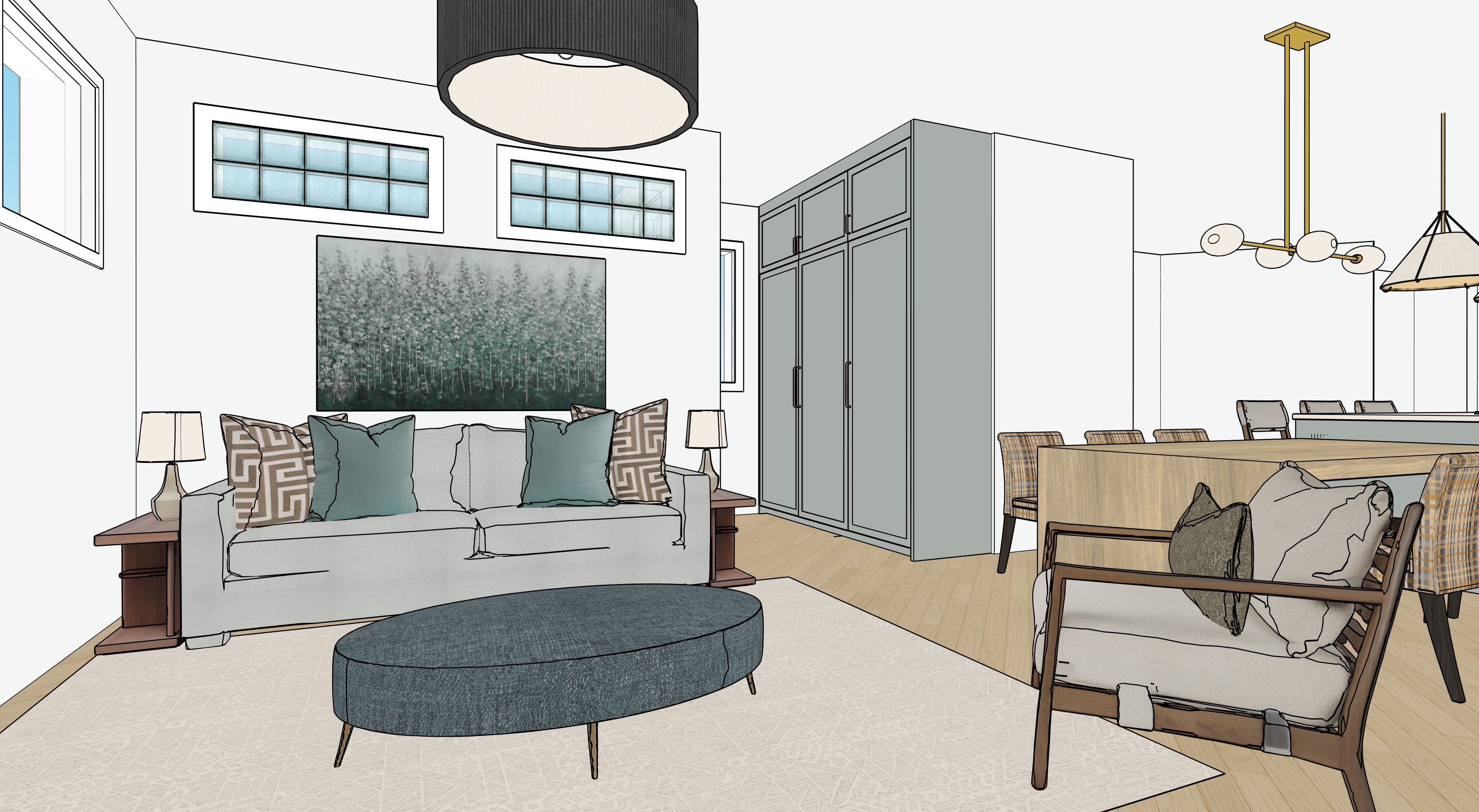 create a cozy and modern living room with a bright airy atmosphere sofa soft gray fabric plush teal and beige decorative pillows with greek key patterns coffee table oval upholstered in textured dark teal fabric with slender brass legs armchair mid century style with rich walnut wood cushions in light cream paired with a dark green pillow rugs light beige with subtle geometric patterns walls crisp white with large abstract art in shades of teal and green depicting a serene forest windows feature frosted glass with light blue hues allowing diffused natural light in ceiling light large pendant lamp with a black exterior and a soft white interior side tables classic mahogany finish each with a stylish cream lamp dining table light oak wood surrounded by chairs upholstered in beige plaid fabric cabinet elegant gray with minimalist black handles chandelier brass with opal glass globes adding a touch of luxury to the dining area emphasize harmony and balance with a blend of textures and neutral tones providing both comfort and style