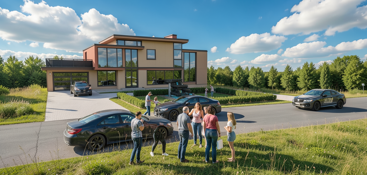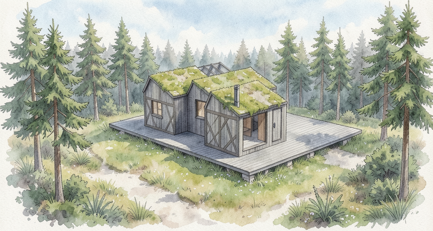 grainy watercolor render of timber frame building with natural wood grey siding green roof covered with moss larch grey terrace don t change dimensions of terrace watercolor pine trees of swedish forest in the background extensive watercolor landscaping surrounding the building don t change facade don t add new windows no moss on glass roof no moss on vertical roof