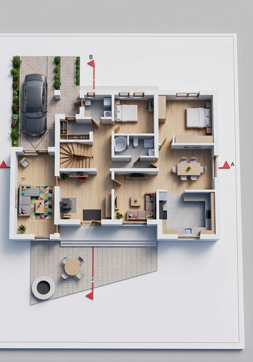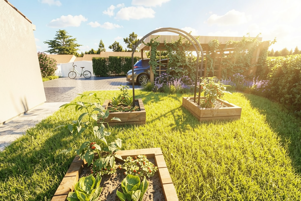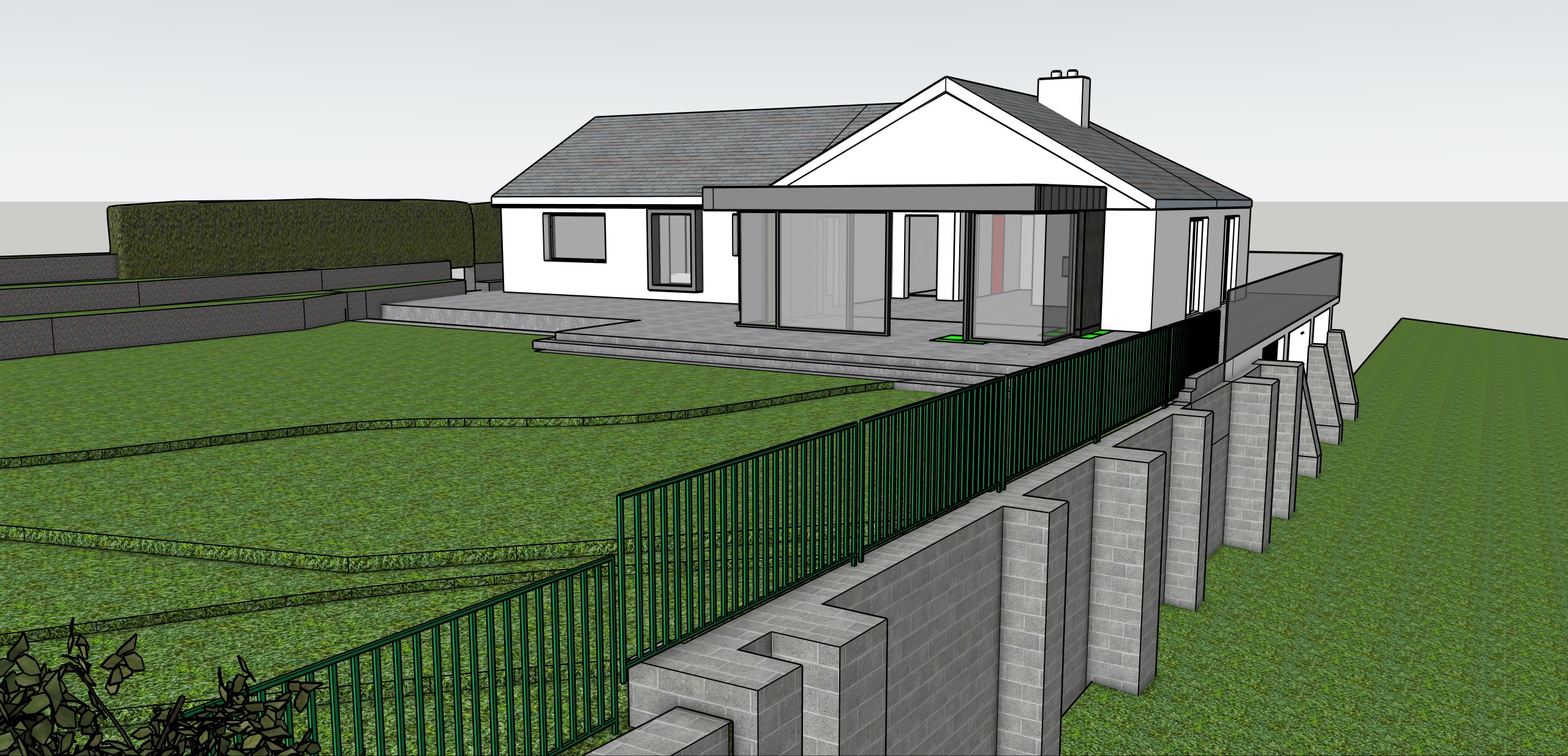render a beautiful modern house with a minimalist design the walls of the house are a pristine white and the roof is a subtle gray large glass windows and doors create a seamless indoor outdoor flow the porch and steps are made of sleek gray limestone stone surround the house with lush vibrant green grass the fence is made of dark green metal adding contrast to the scene include a neatly trimmed hedge at the back with a deep green hue and a trimmed shrubbery in the foreground set the atmosphere under a clear blue sky with soft natural daylight