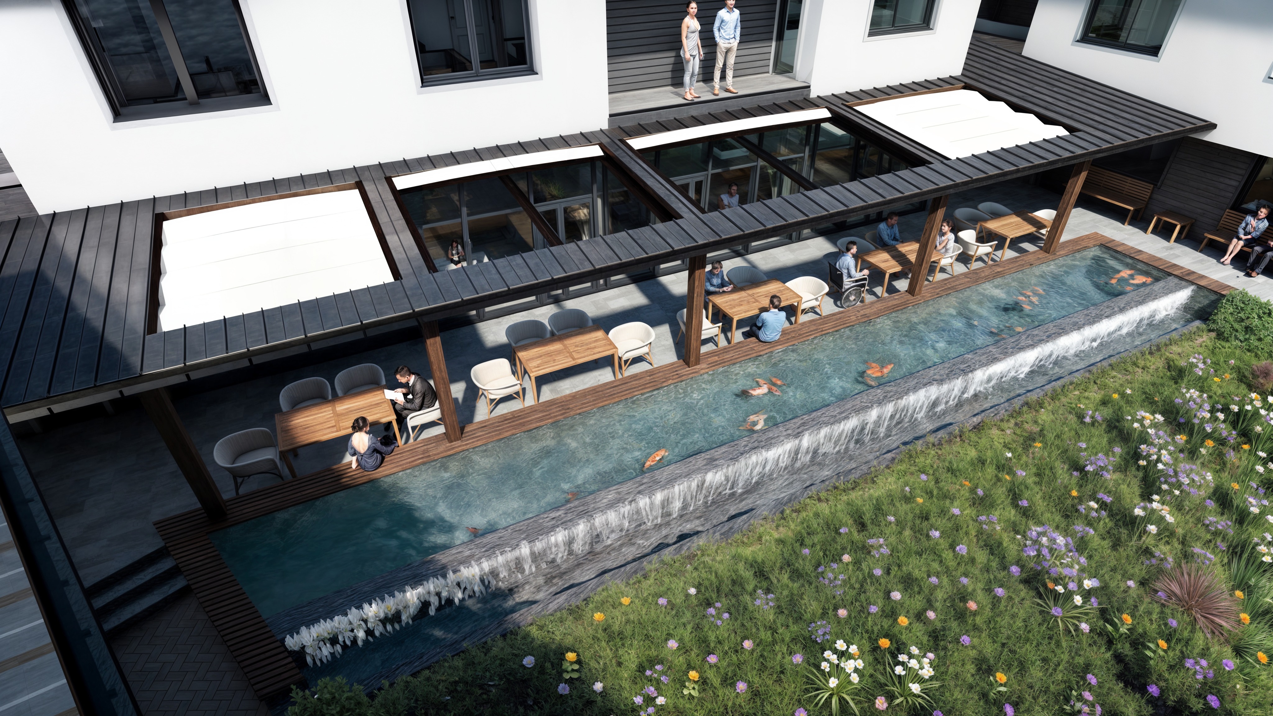 a modern outdoor terrace courtyard viewed from above featuring a contemporary residential building with a clean white plaster facade and dark wooden elements the architecture is minimal and refined with a covered terrace defined by dark wooden beams and columns the space includes a long elegant water feature with clear water visible fish and a smooth overflow edge creating a calming and premium atmosphere the terrace is furnished with high quality wooden tables and upholstered chairs in neutral tones arranged in a clean and organized layout people are naturally interacting sitting and socializing in a relaxed environment adjacent to the water feature a landscaped garden includes ornamental grasses and colorful flowers in a natural composition the lighting is bright natural daylight with soft balanced shadows clearly illuminating both the terrace and the building facades materials such as wood glass and plaster are rendered with realistic textures and subtle imperfections the overall mood is serene elegant and high end with a photorealistic architectural visualization