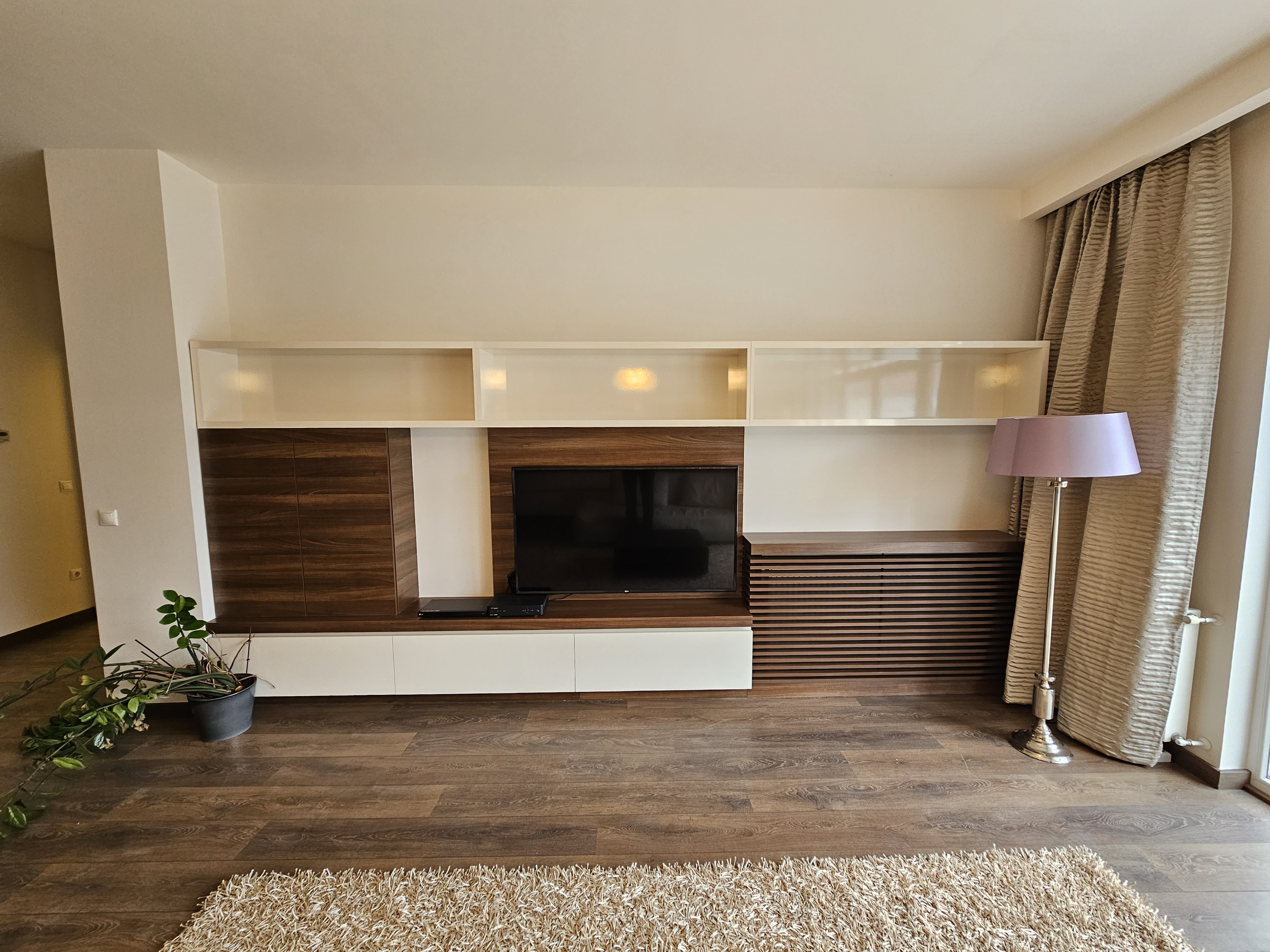 the furniture should be symmetrical the television should be in the middle the brown wood should be canadian oak the white shelf should be on the ceiling