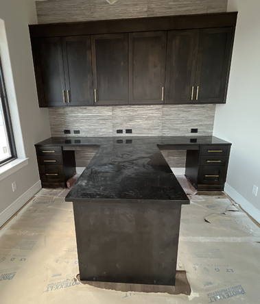 do not change the cabinets in any way preserve the exact cabinet colors materials finishes dimensions door and drawer styles hardware spacing alignment and all geometry exactly as shown do not alter the countertop shape backsplash appliances flooring lighting fixtures or wall structure only remove the construction materials clutter and mess from the scene clean the room and make it look finished and staged add a few simple tasteful home accessories appropriate for the style of the space but do not add or remove any furniture windows or architectural elements maintain the original lighting direction and realism enhance clarity and polish the photo while keeping the cabinetry and room design completely unchanged do not alter the lighting to keep the cabinet colors as they are in the image add flooring desk chairs to both sides of the table clean the countertops off the dust stage for a modern shared office add a nice view out the window