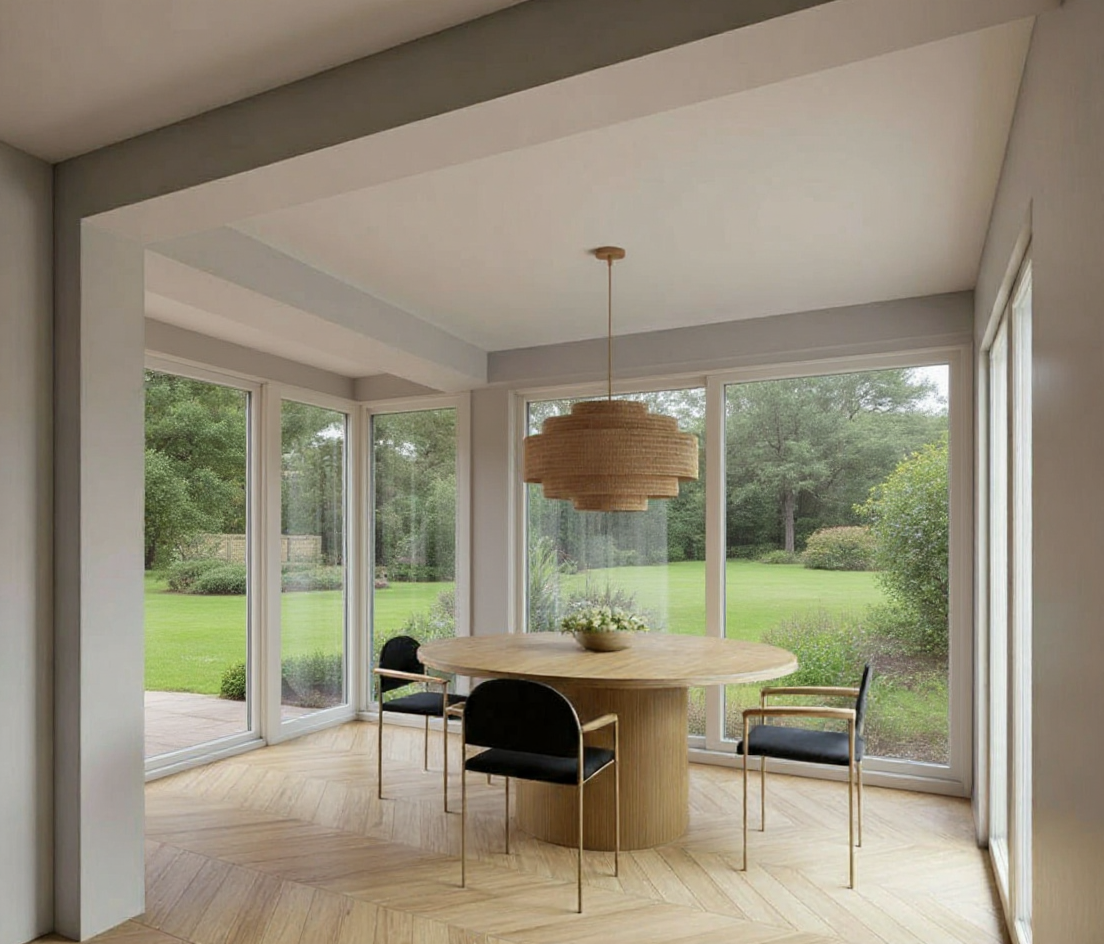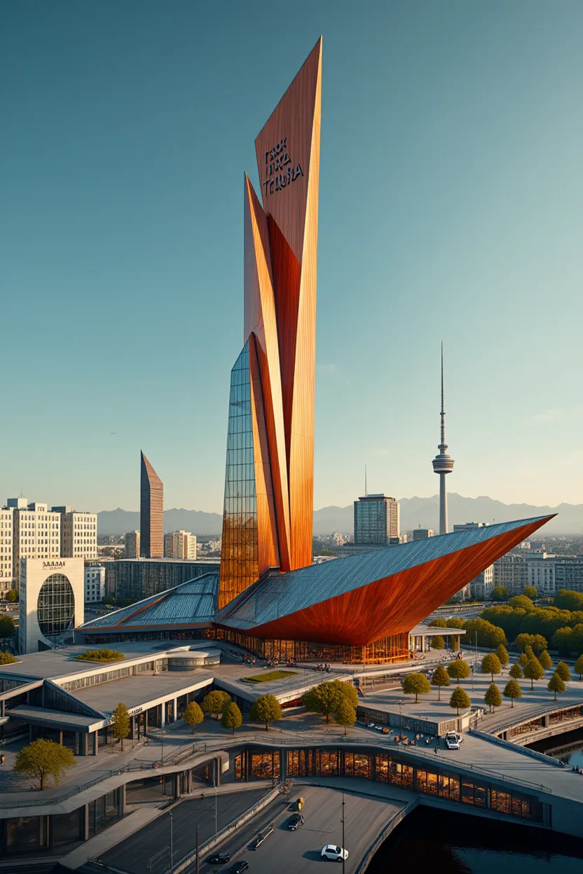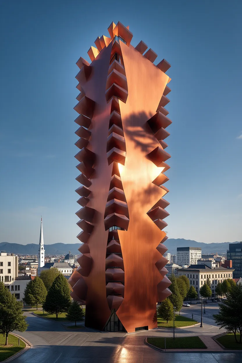 deconstructivism exterior shot render a futuristic cityscape with a striking angular structure in the center featuring sleek geometric lines the structure should be a warm bronze color reflecting the glow of a setting sun surrounding buildings in the background should include a mixture of modern and traditional architecture use soft pastels for the mountains in the distance creating a serene backdrop the sky should be a gradient of soft blues capturing the tranquil ambiance of early evening incorporate lush greenery around the base of the structure to contrast with the warm tones of the architecture make it similar to trump tower in chicago architecture