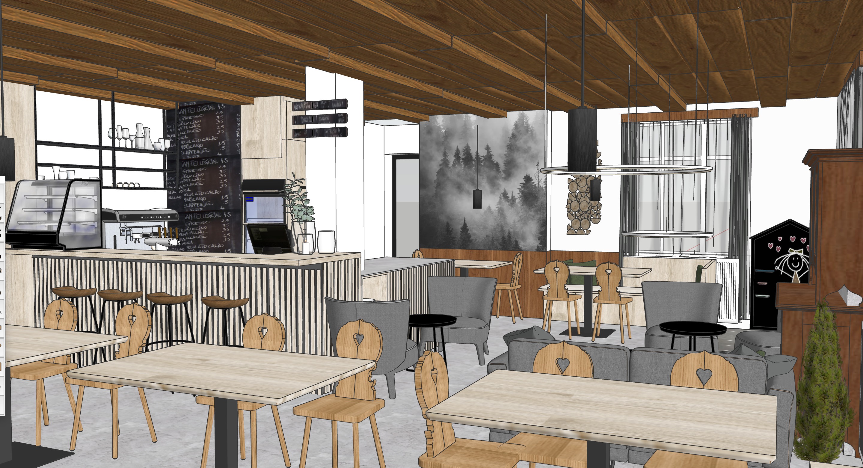 a cozy cafe interior with a warm and inviting atmosphere the ceiling is rich brown wood complementing the light natural wood tables and chairs with heart shaped cutouts dark gray textured bar stools at the counter which features a vertical slat design the chalkboard menu is written in white on a black background a misty forest mural in grayscale adds depth to the rear wall curtains are sheer soft gray allowing gentle light to filter through there is a small plant on the counter adding greenery ensure the lighting is warm and ambient creating a welcoming and peaceful environment